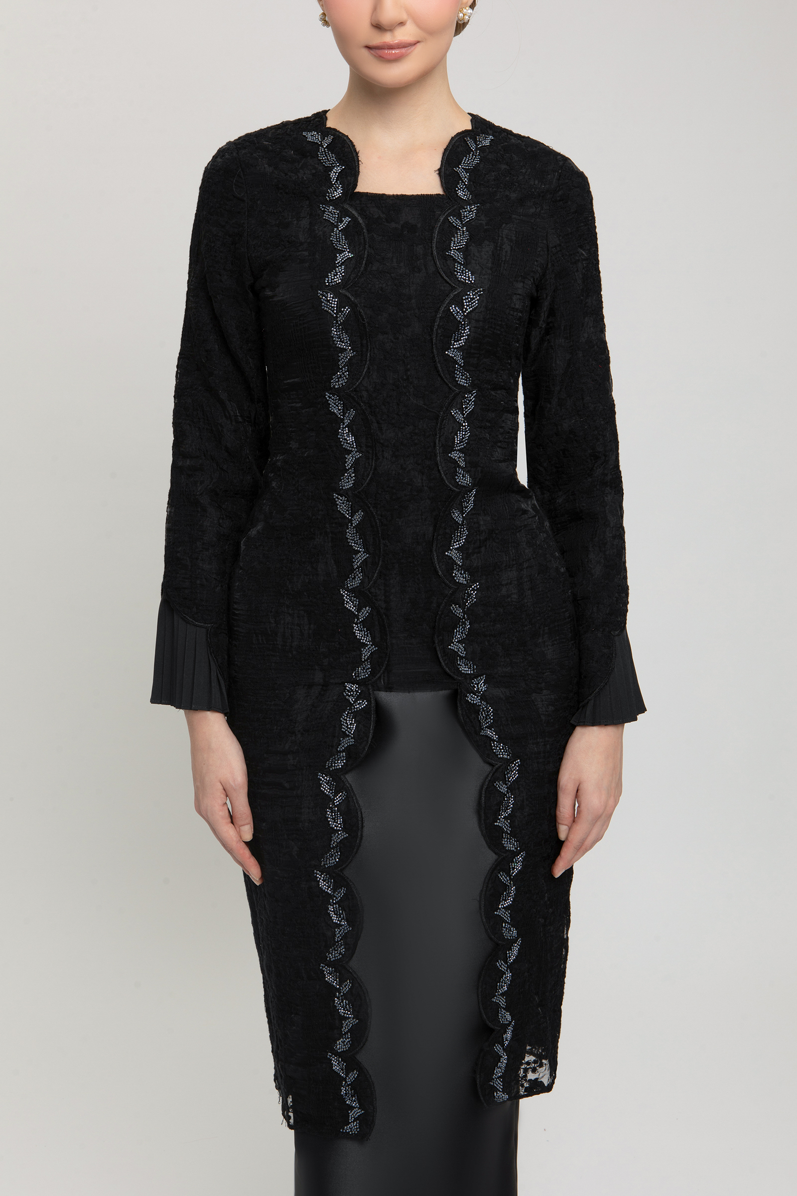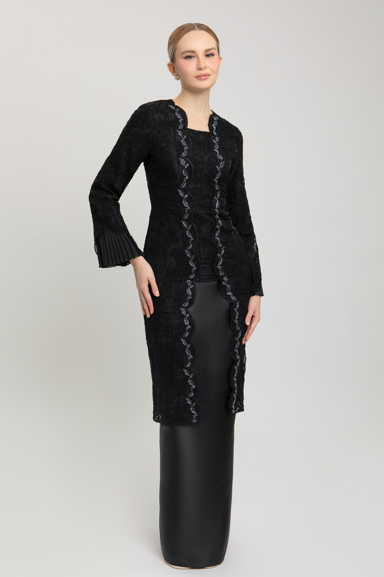 ALMIRA KURUNG crafted from embroidered organdy with poly-blend, features a square neckline with beading, embroidered edge hem on top and sleeves, sleeves with poly-blend pleated layers, and back zipper, paired with a shantung skirt with metallic sheen finishing, pencil silhouette, back zipper, back pleat, and halfway elastic waistband
