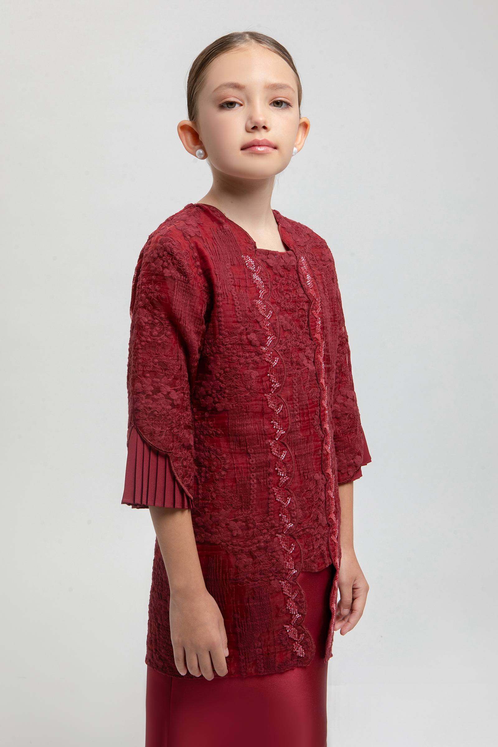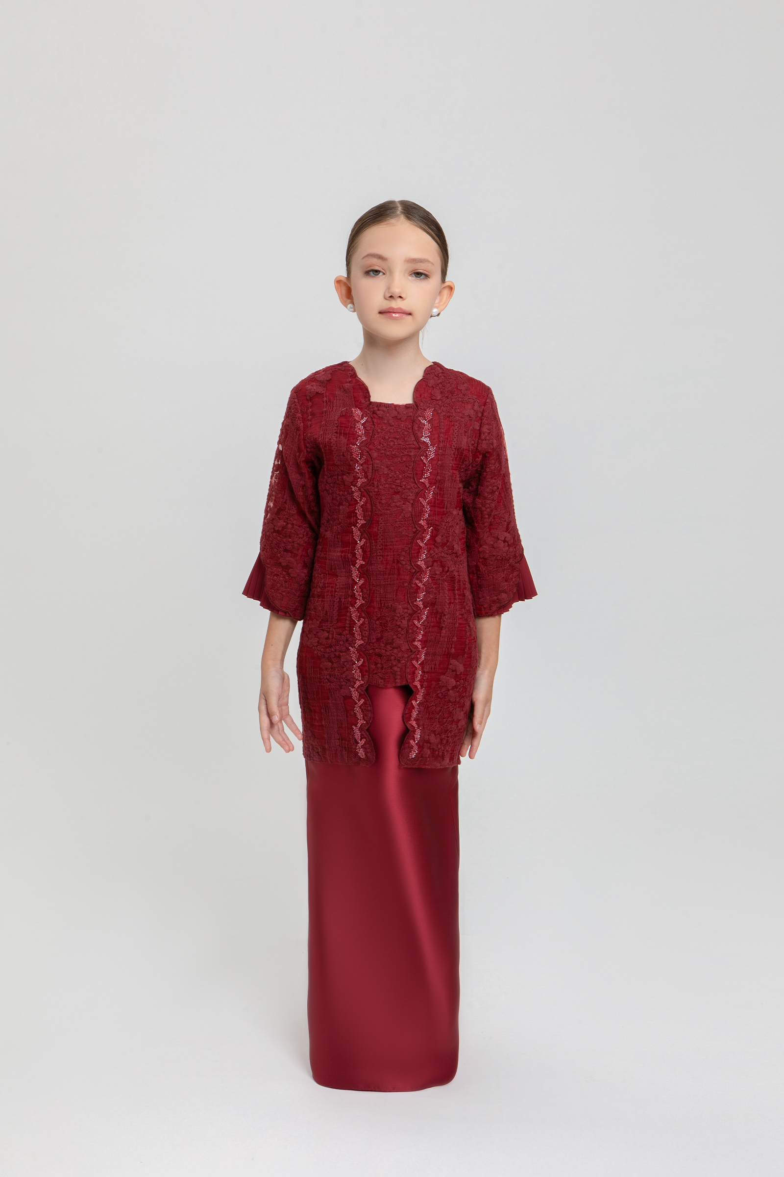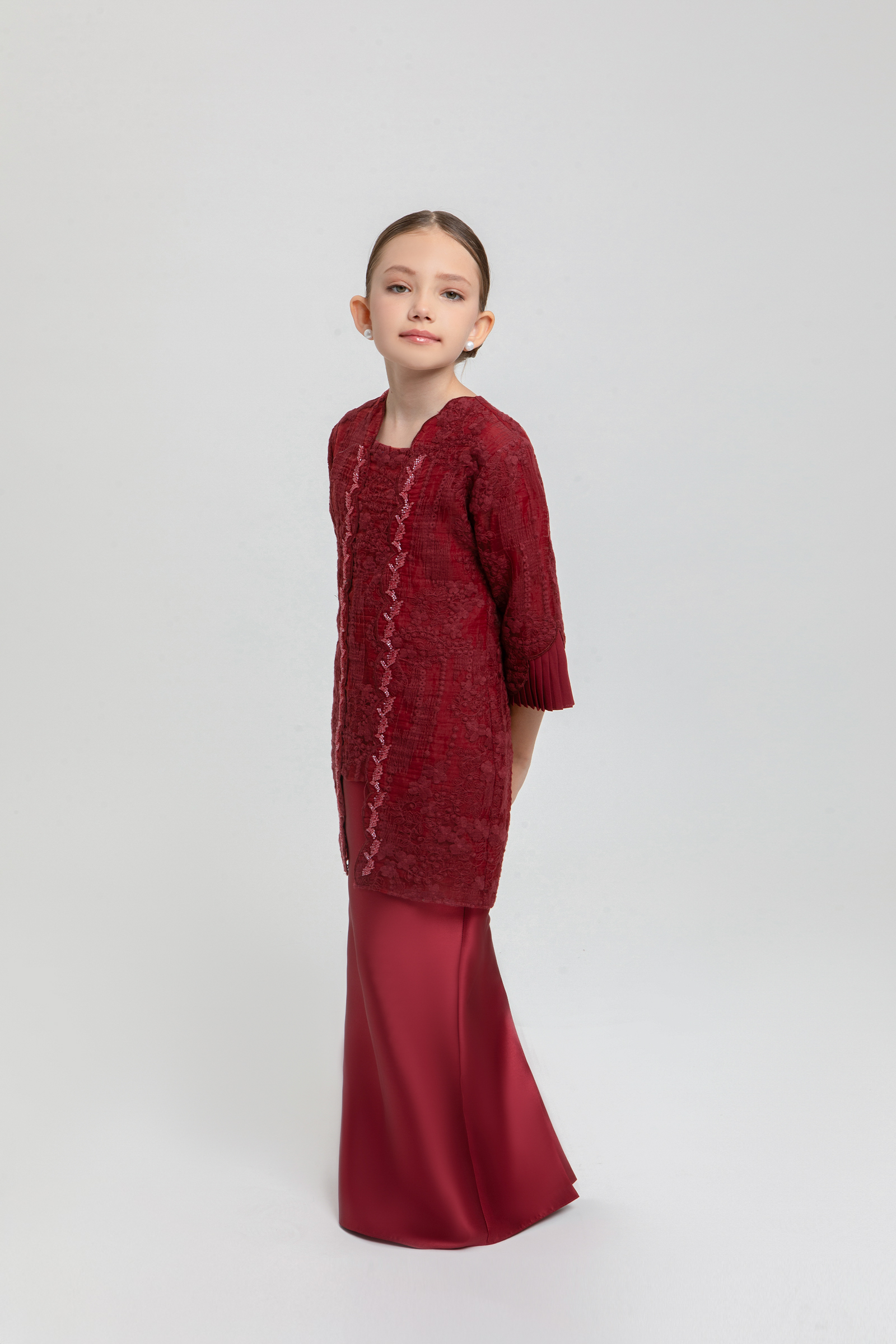 ALMIRA KURUNG KIDS crafted from embroidered organdy with poly-blend, features a square neckline with beading, embroidered edge hem on top and sleeves, sleeves with poly-blend pleated layers, and back zipper, paired with a shantung skirt with metallic sheen finishing, pencil silhouette, back zipper, back pleat, and full elastic waistband.