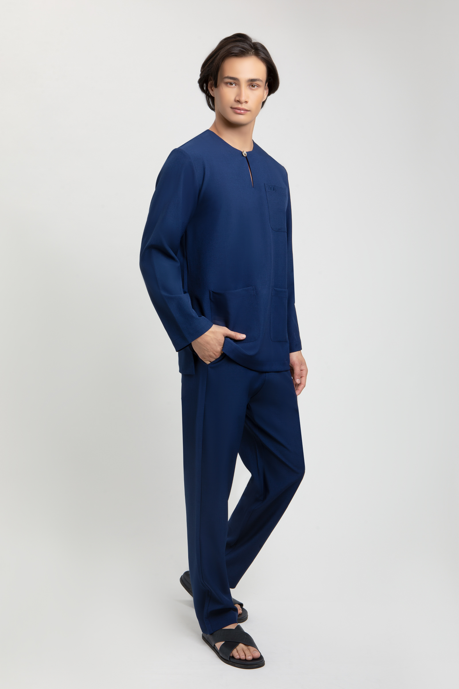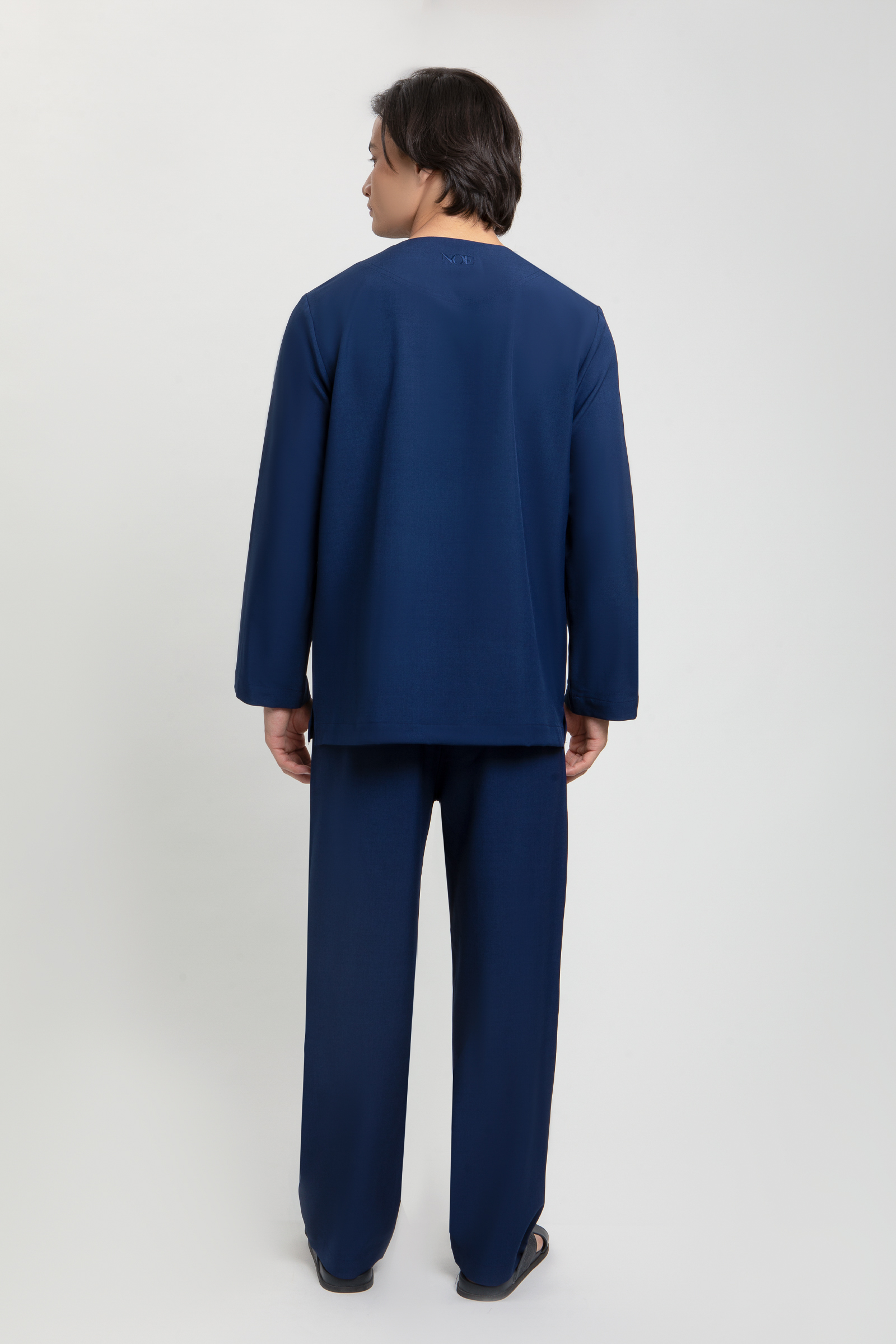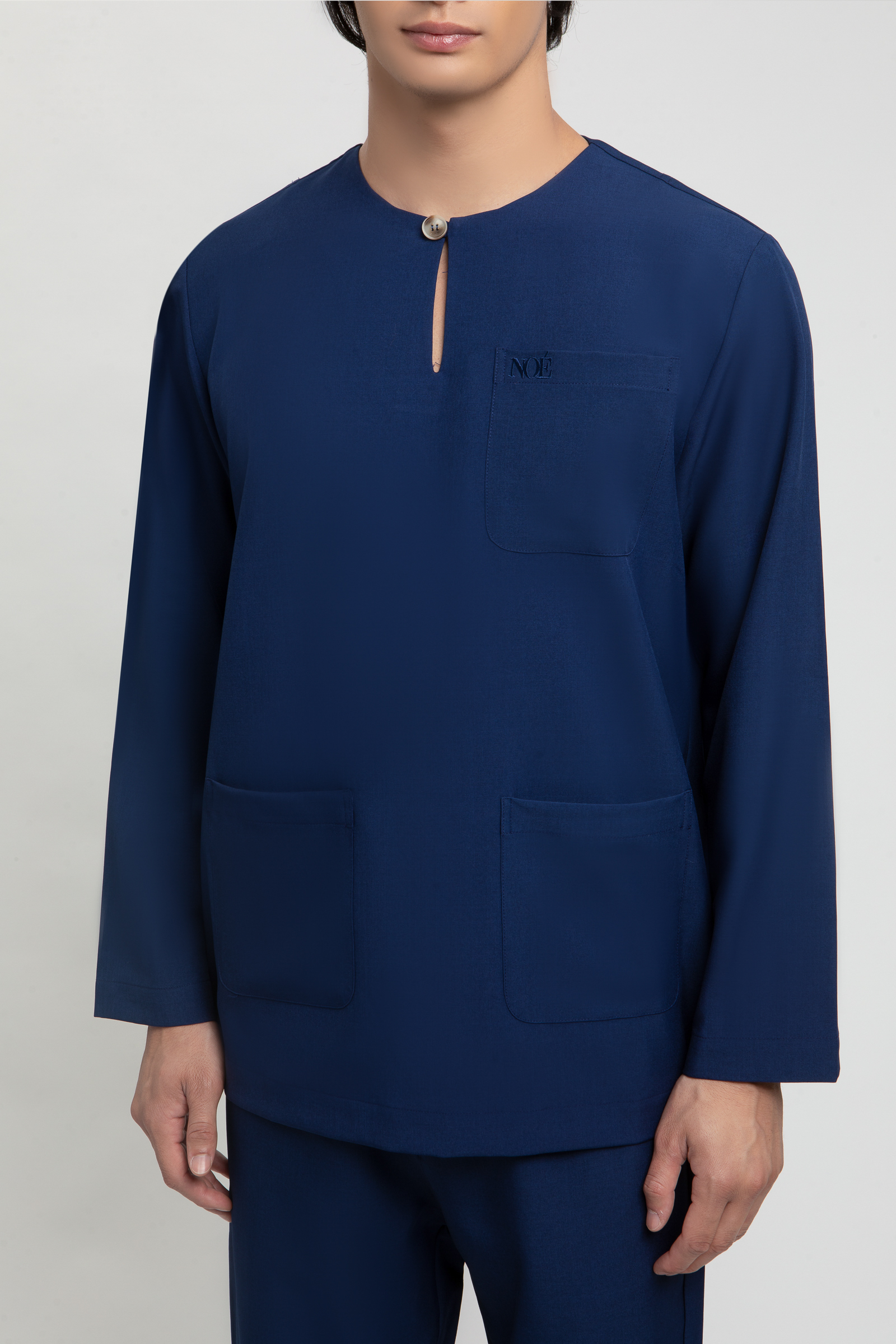 Areez Teluk Belanga features a classic Teluk Belanga top with a signature NOE buton, NOE embroidery on the pocket and back neckline, 3 pockets and subtle side slits. It is paired with matching pants designed with a halfway waistband, front zip and button fastening and two side pockets for a clean, polished festive look.