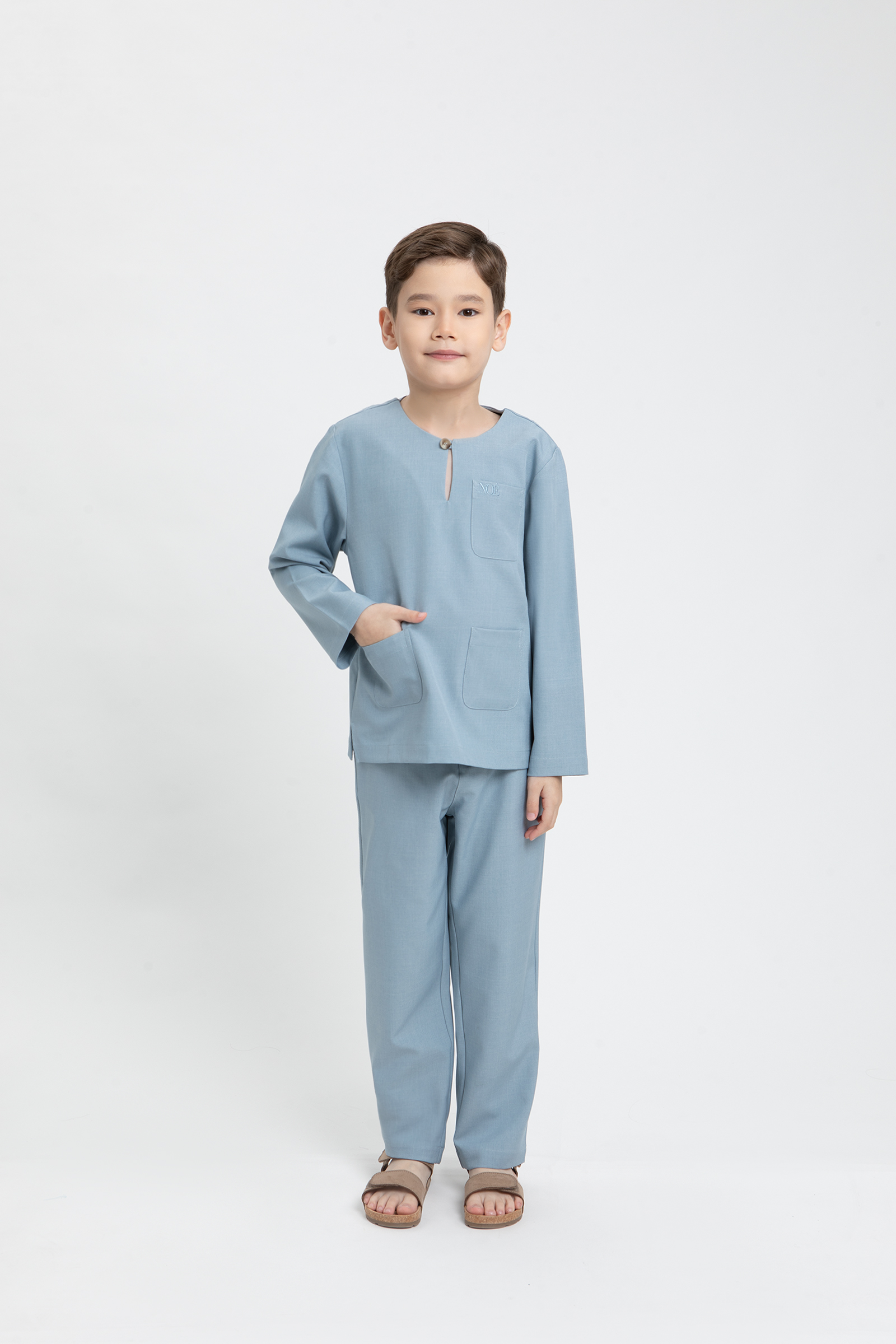 Areez Teluk Belanga Kids features a classic Teluk Belanga top with a signature NOE buton, NOE embroidery on the pocket and back neckline, 3 pockets and subtle side slits. It is paired with matching pants designed with a halfway waistband, front zip fastening and two side pockets perfect for a polished Raya look.
