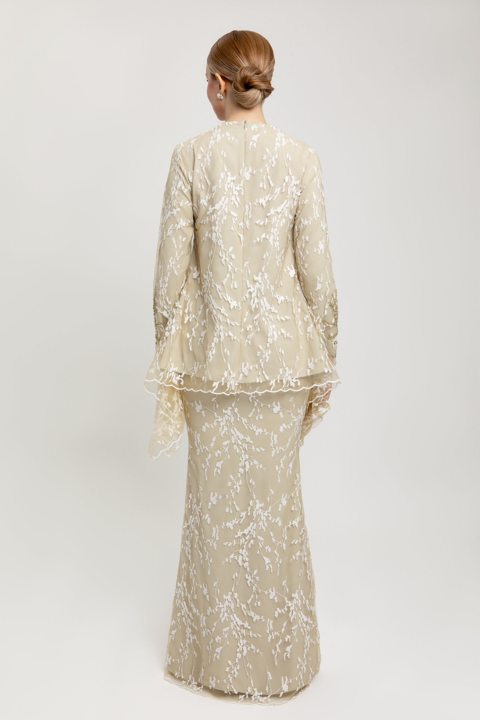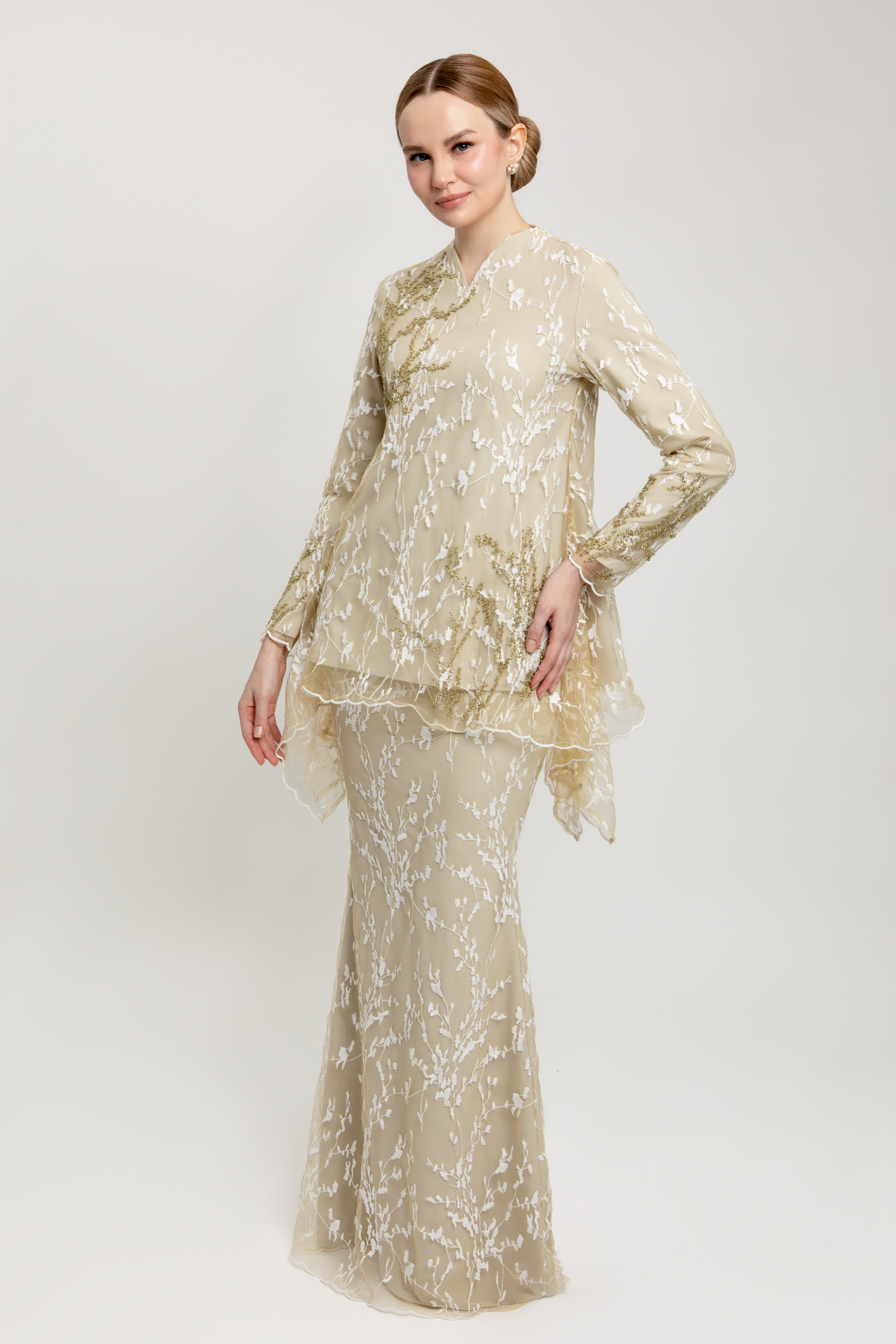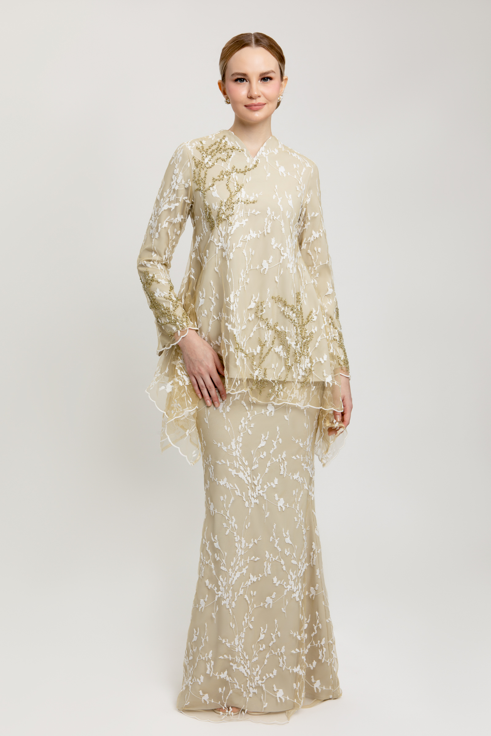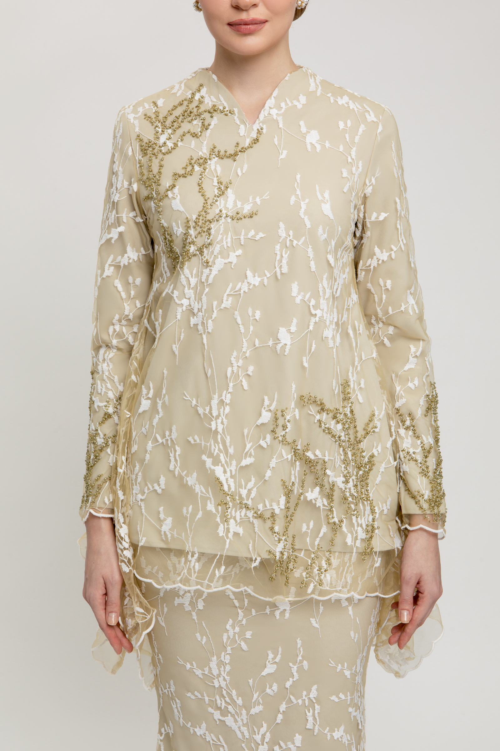 AURELLE KURUNG crafted from net flower lace with poly-blend and full lining, features a V-neck with full lace detailing, beaded embellishment, beaded sleeves with zipper, embroidered edge hem on top and sleeves, and back zipper, paired with a matching net flower lace mermaid skirt with full lace, side zipper, full lining, and halfway elastic waistband.