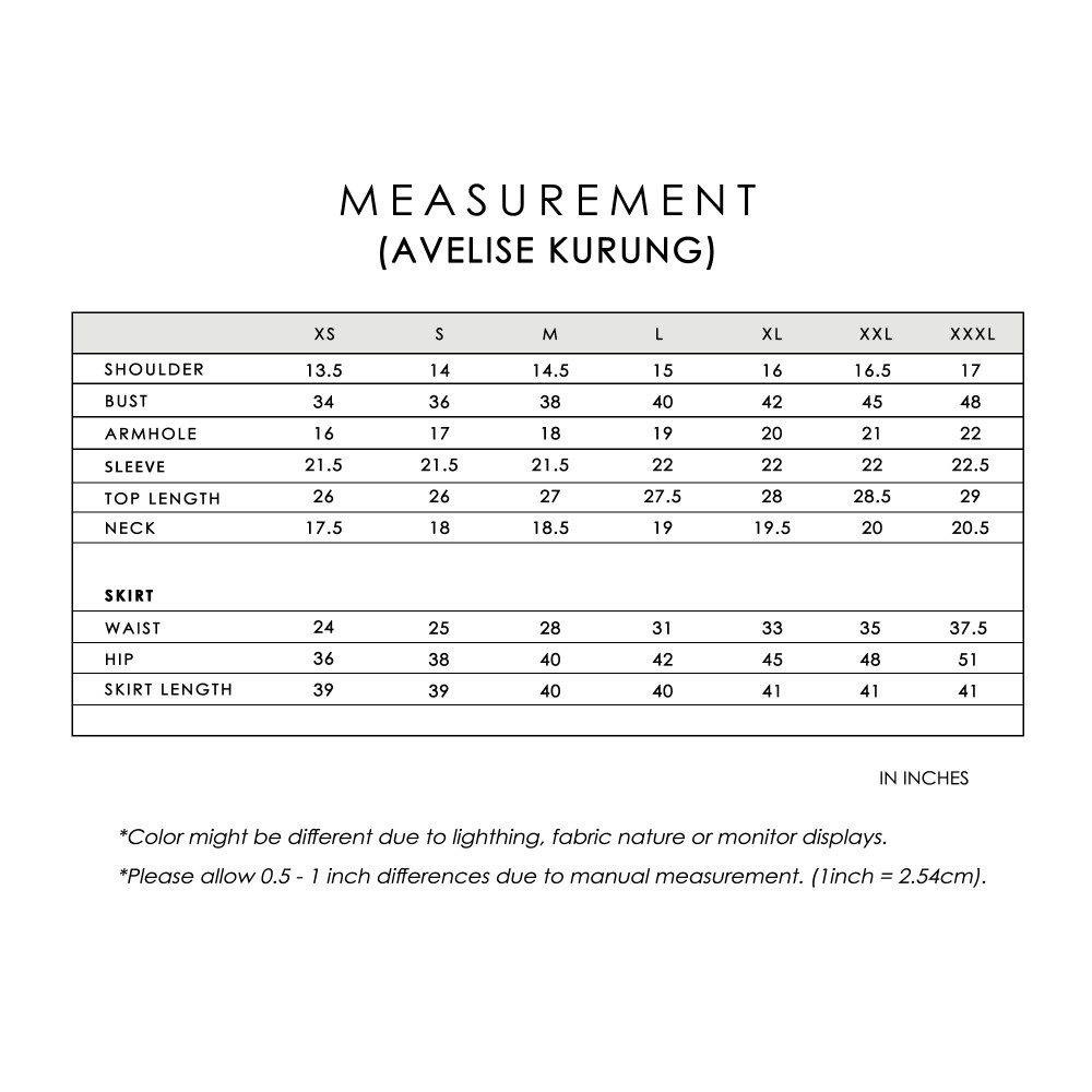 AVELISSE KURUNG crafted from shantung with metallic sheen finishing and poly-blend, fully lined, features a V-neck with border lace, floral lace patch with sequins and pearl beading, transparent organdy with embroidered edges, layered transparent organdy sleeves, and back zipper, paired with a poly-cotton blend pencil skirt with back zipper, back pleat, and halfway elastic waistband