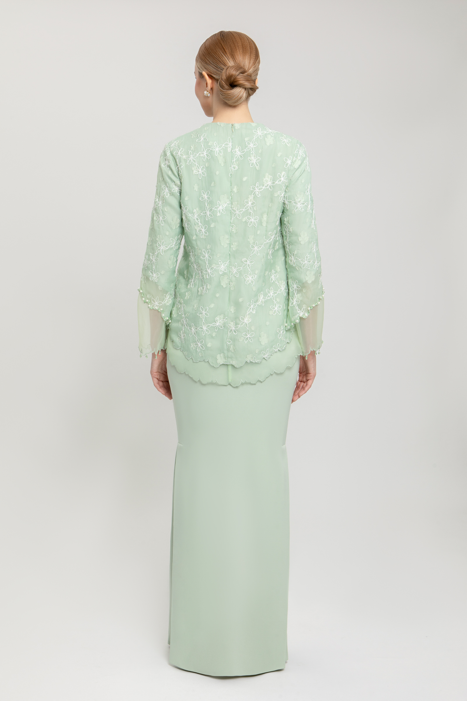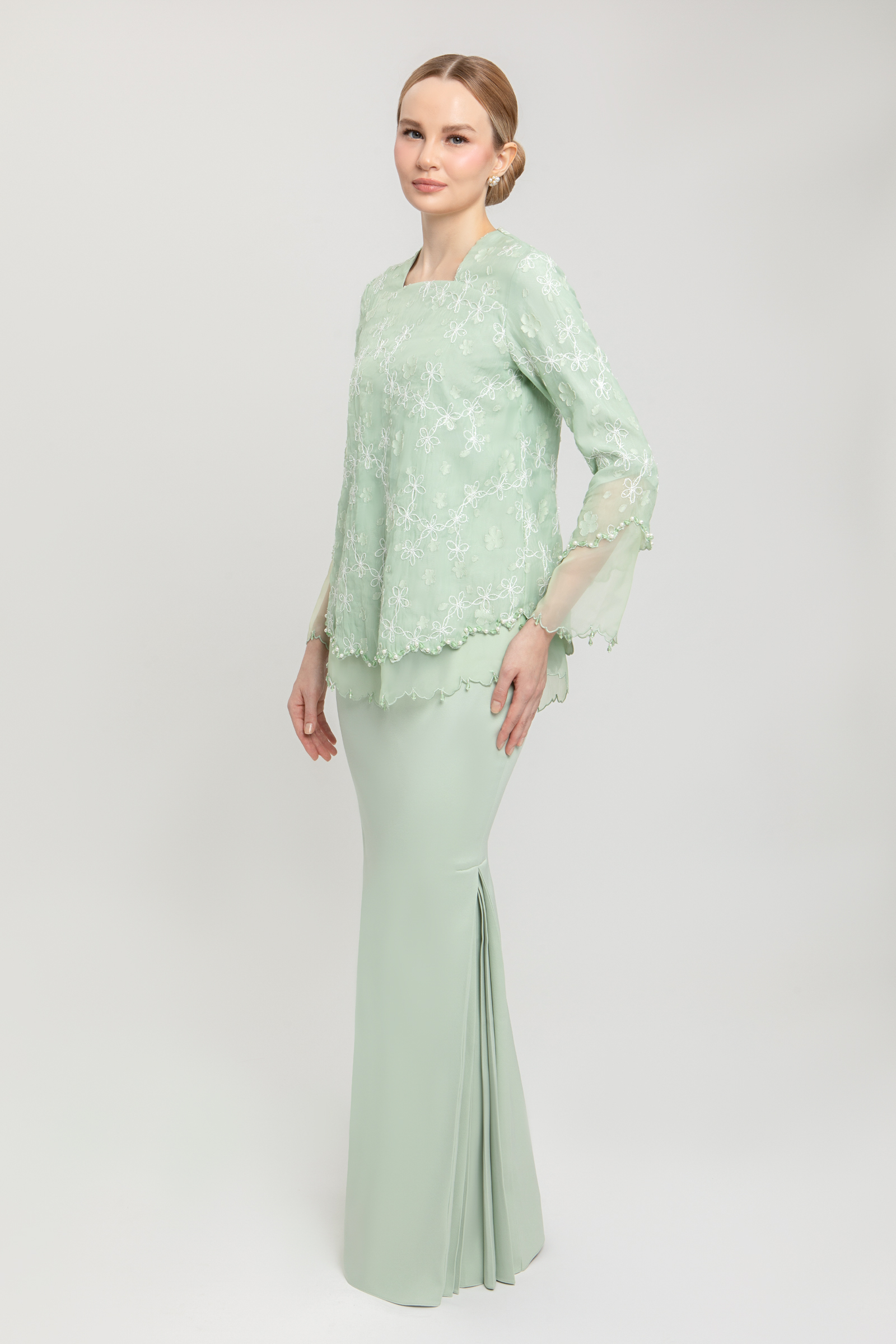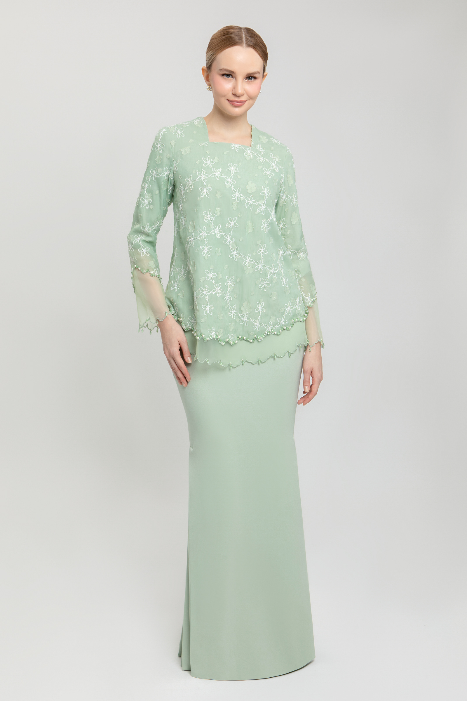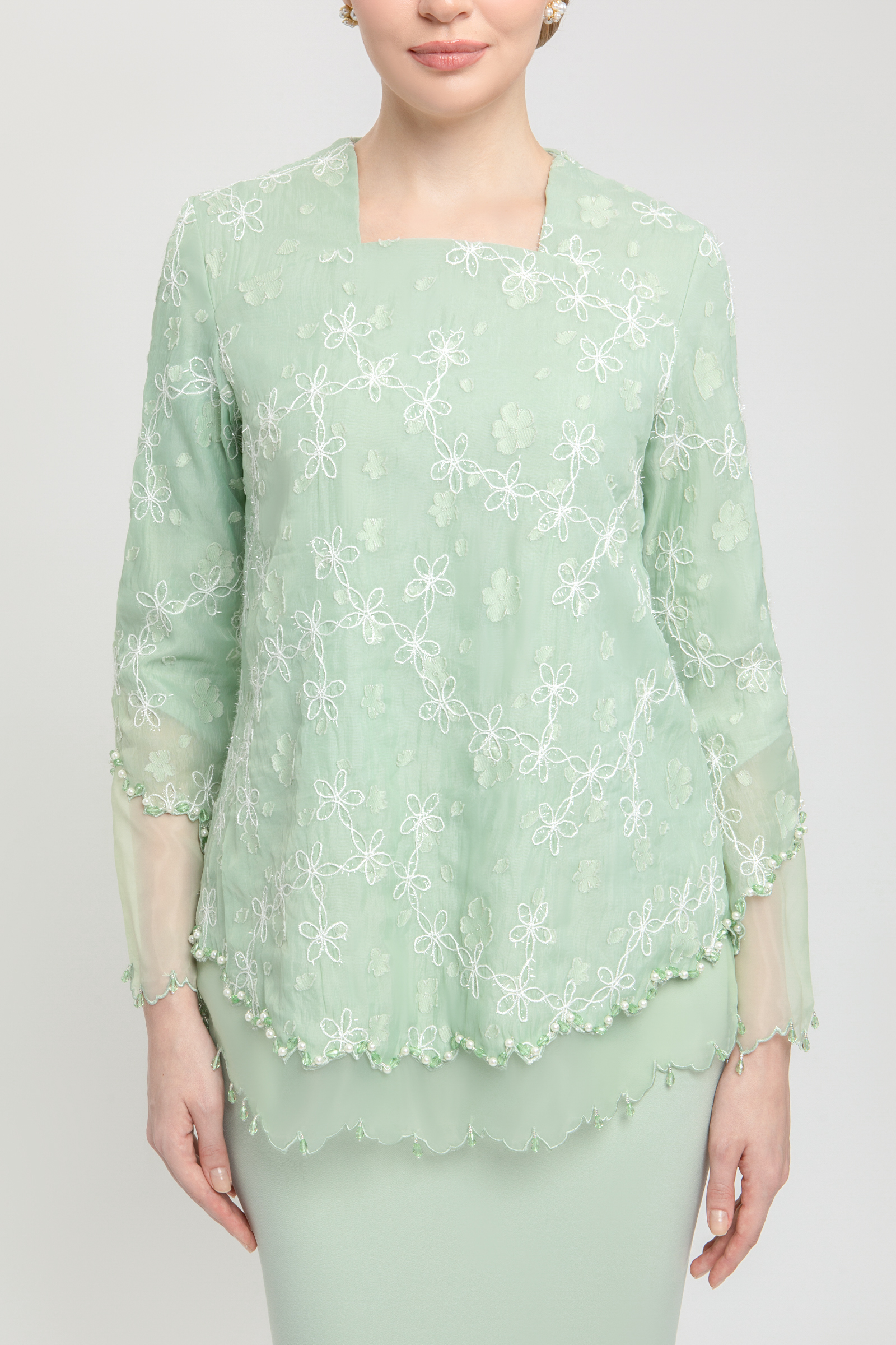 BLANCHE KURUNG crafted from embroidered organdy with full lining, features a square neckline with front yoke, layered organdy with delicate beading, transparent organdy sleeves with embroidered edges, and back zipper, paired with a poly cotton blend skirt with halfway elastic waistband, side zipper and side pleats on both left and right.