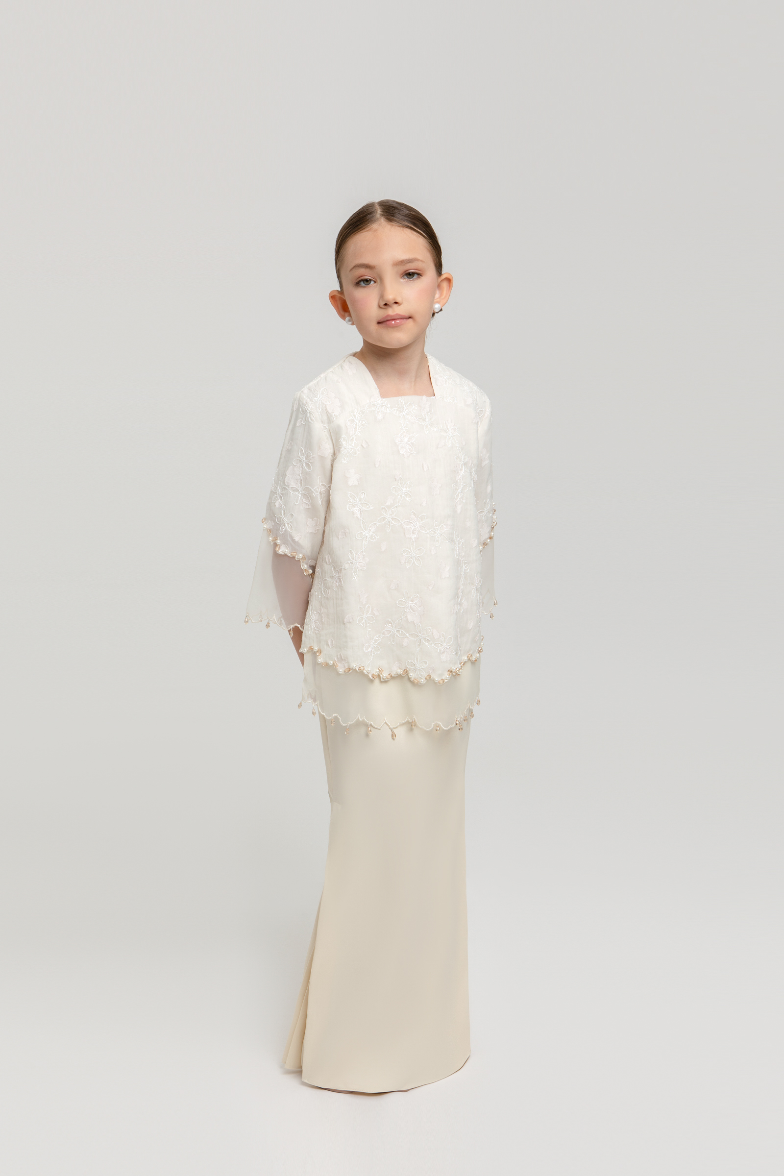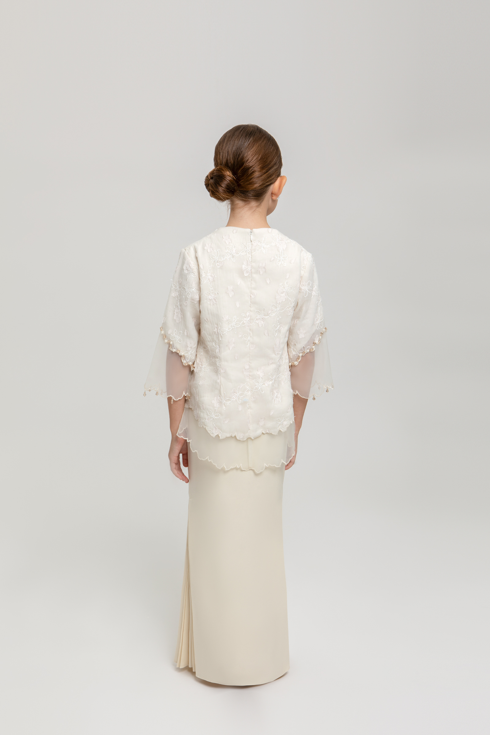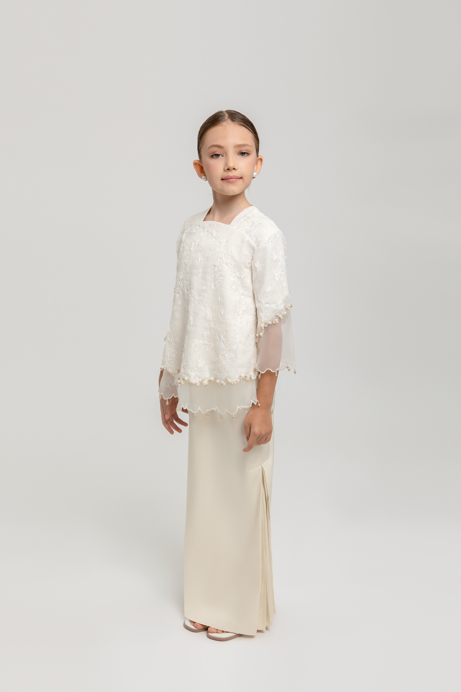 BLANCHE KURUNG KIDS crafted from embroidered organdy with full lining, features a square neckline with front yoke, layered organdy with delicate beading, transparent organdy sleeves with embroidered edges, and back zipper, paired with a poly cotton blend skirt with halfway elastic waistband, side zipper and side pleats on both left and right.