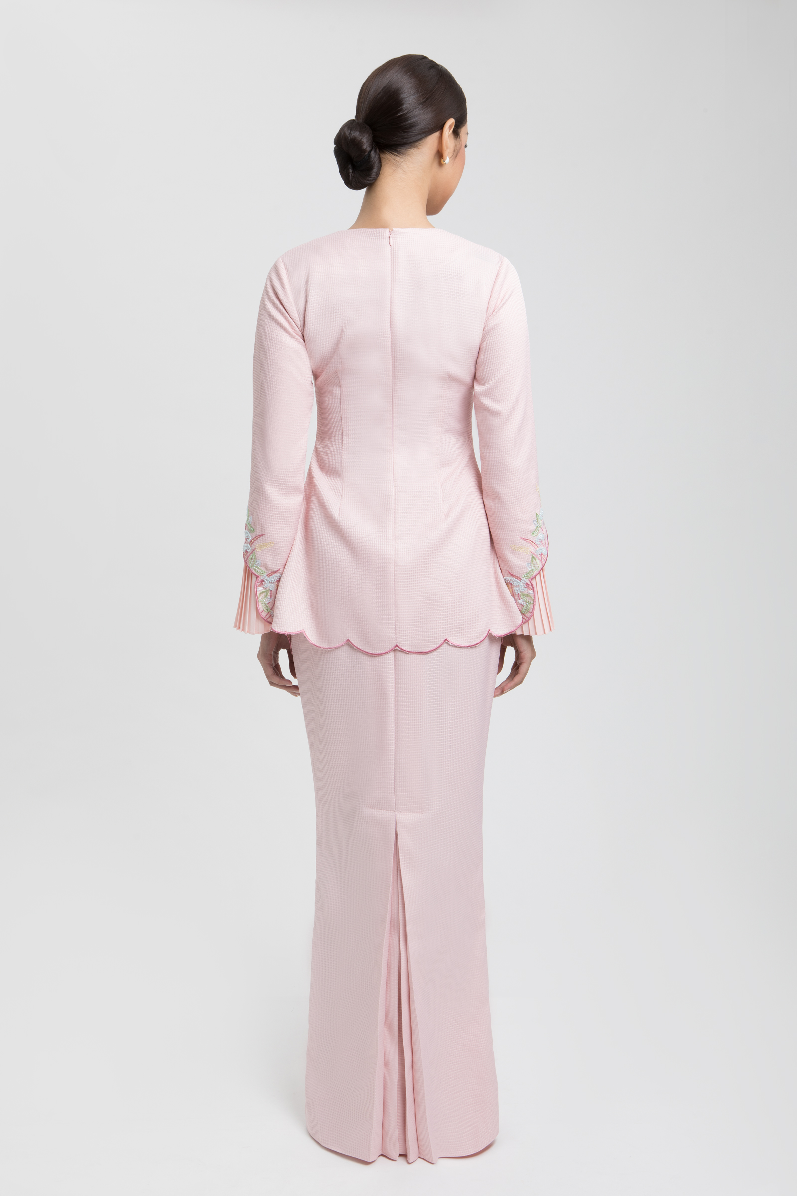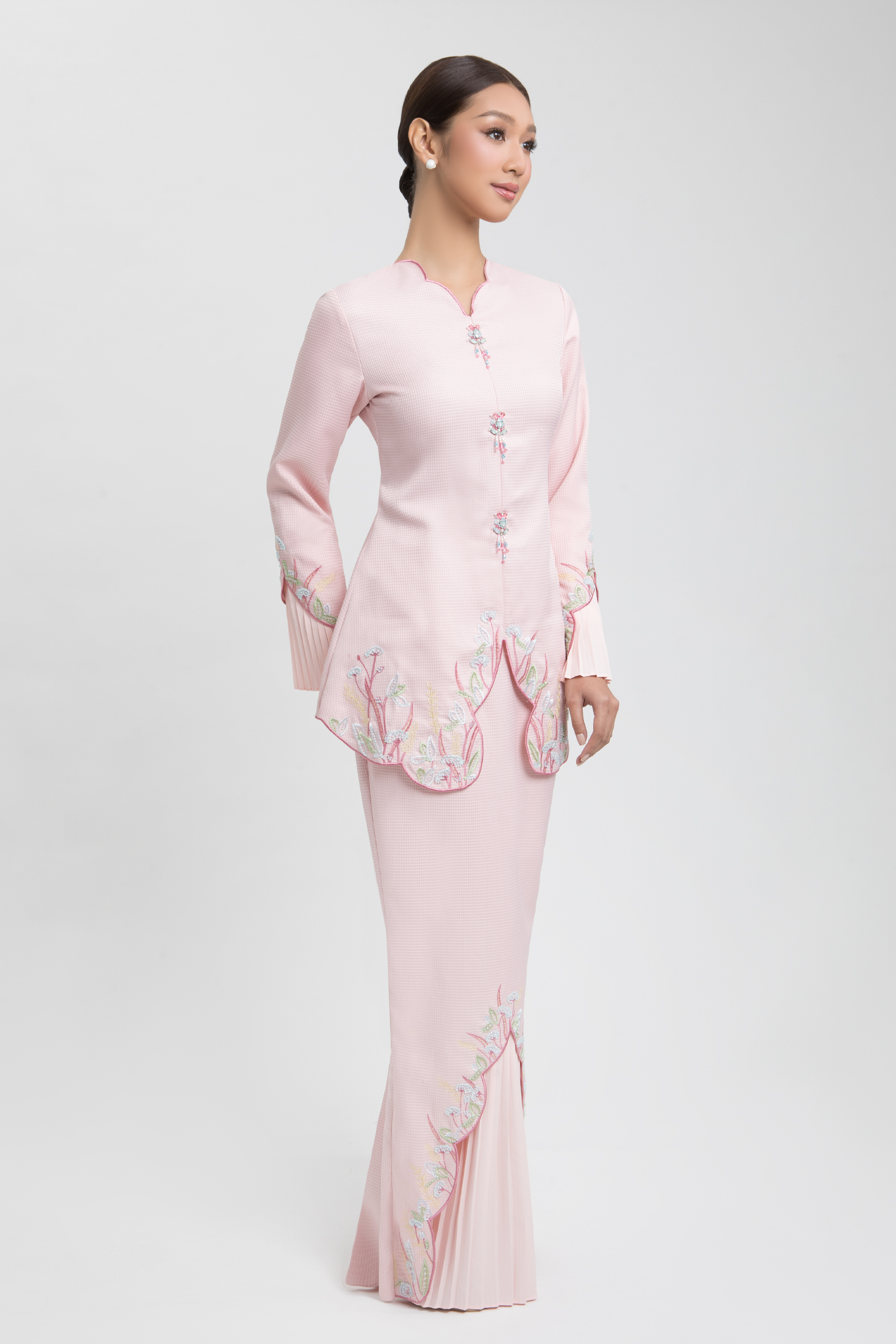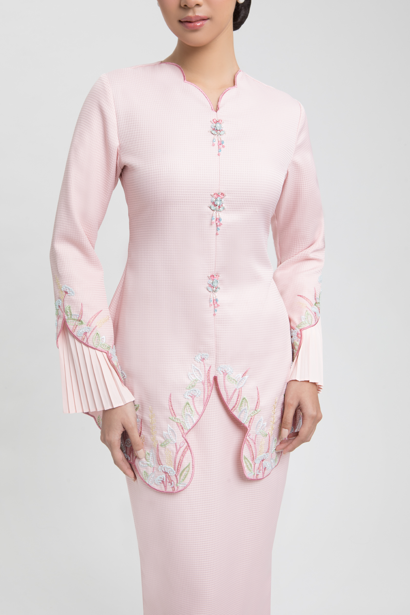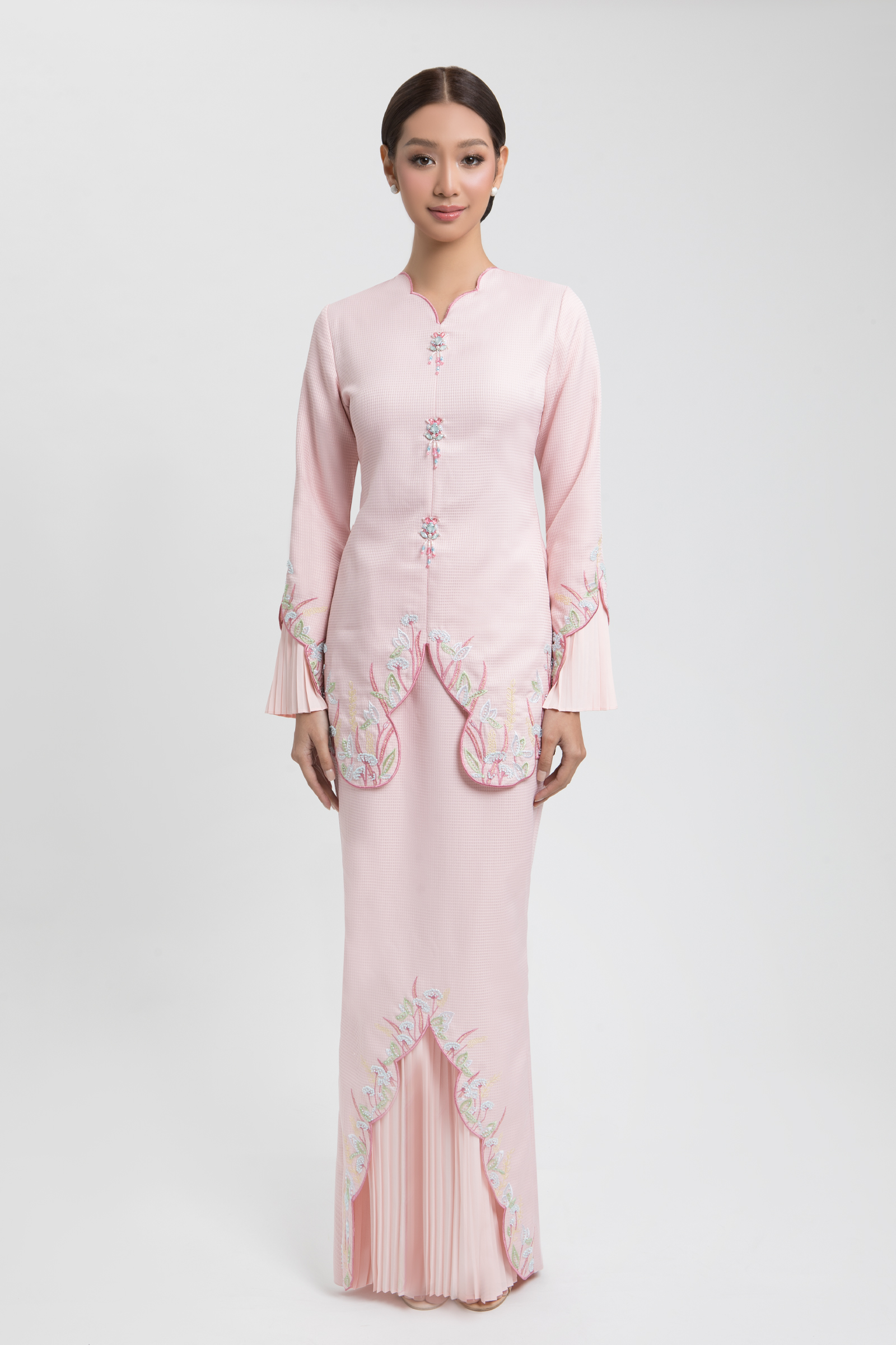 DESIREE KURUNG crafted from jacquard cotton blend, features a V-neckline with embroidery and front brooch, floral embroidery with beading and wavy edges on the top and pleated sleeves, completed with a back zipper, paired with a matching skirt with front lining aritachi with halfway elastic waistband, back pleats, and front pleated lining with floral embroidery, beading and wavy edges.