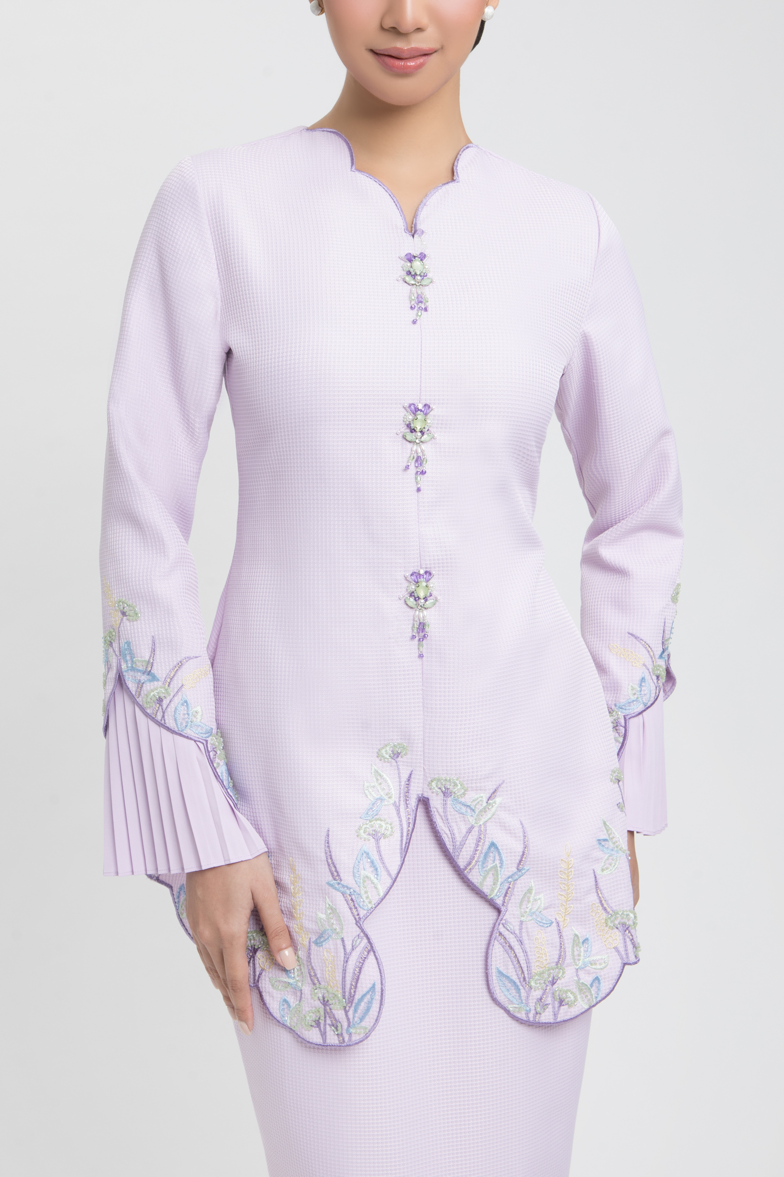 DESIREE KURUNG crafted from jacquard cotton blend, features a V-neckline with embroidery and front brooch, floral embroidery with beading and wavy edges on the top and pleated sleeves, completed with a back zipper, paired with a matching skirt with front lining aritachi with halfway elastic waistband, back pleats, and front pleated lining with floral embroidery, beading and wavy edges.