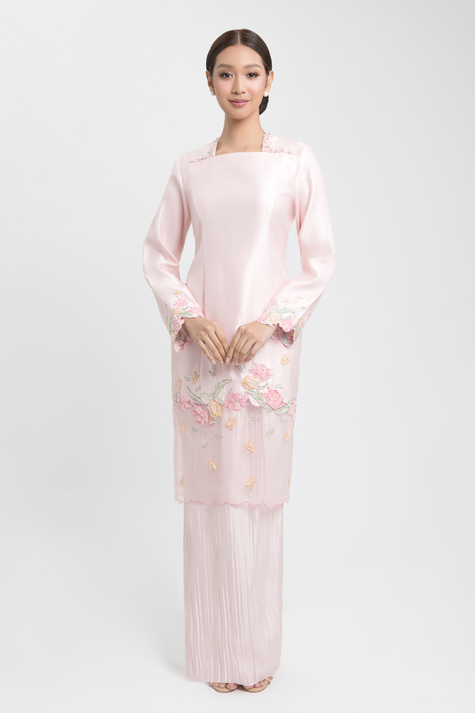 EDELINA KURUNG crafted from satin crepe, features a V-neckline with beading, front yoke, princess cut, floral embroidery with beading layered with organza, embroidered hem and sleeves, completed with back zipper, paired with a matching satin crepe skirt with halfway elastic waistband, back zipper and full pleats.