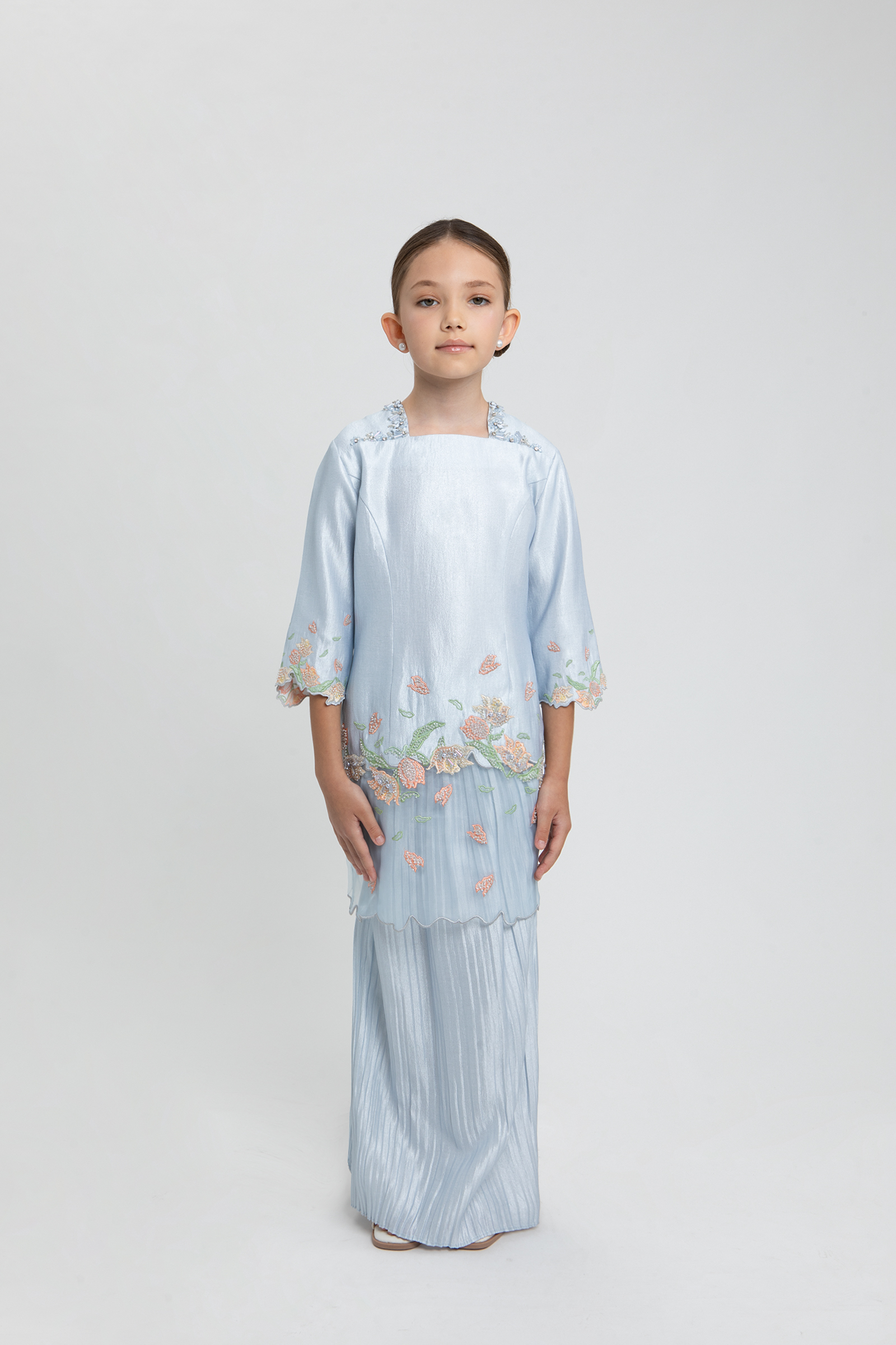 EDELINA KURUNG KIDS crafted from satin crepe, features a V-neckline with beading, front yoke, princess cut, floral embroidery with beading layered with organza, embroidered hem and sleeves, completed with back zipper, paired with a matching satin crepe skirt with full elastic waistband and full pleats.