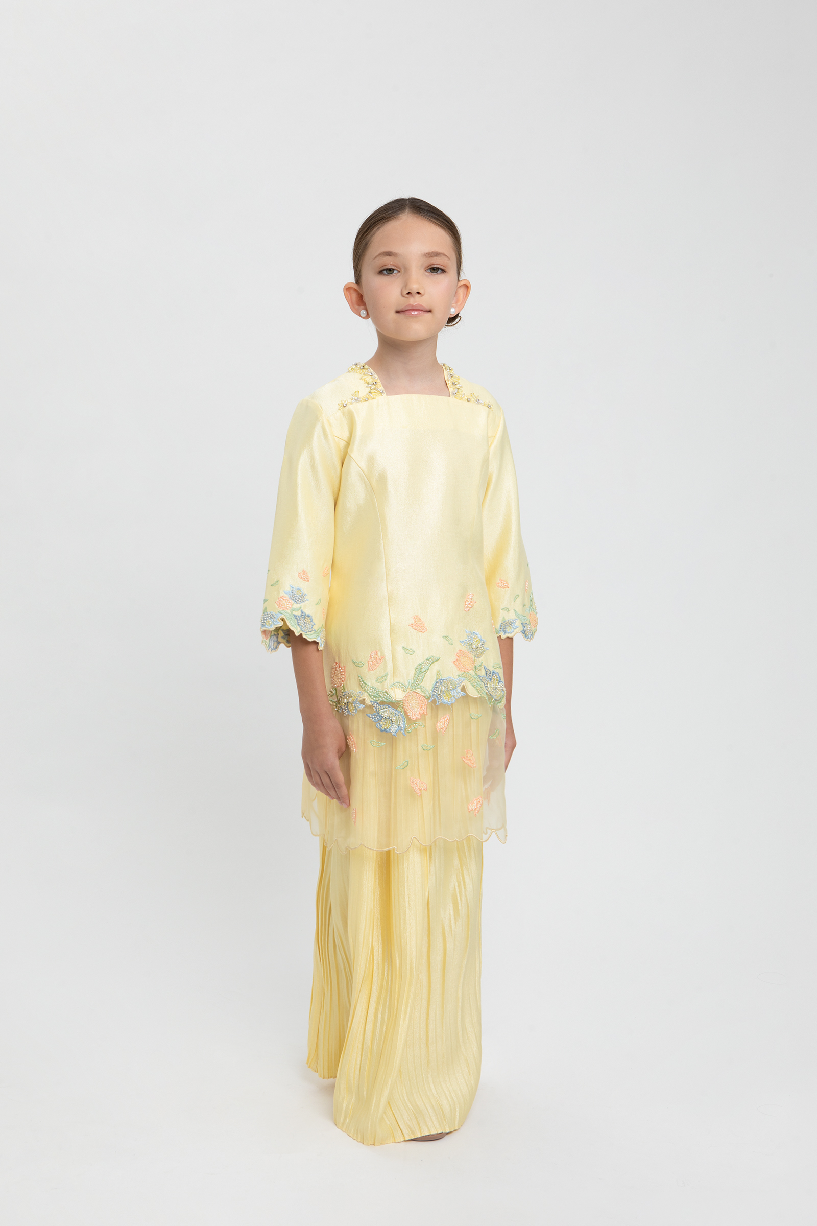 EDELINA KURUNG KIDS crafted from satin crepe, features a V-neckline with beading, front yoke, princess cut, floral embroidery with beading layered with organza, embroidered hem and sleeves, completed with back zipper, paired with a matching satin crepe skirt with full elastic waistband and full pleats.