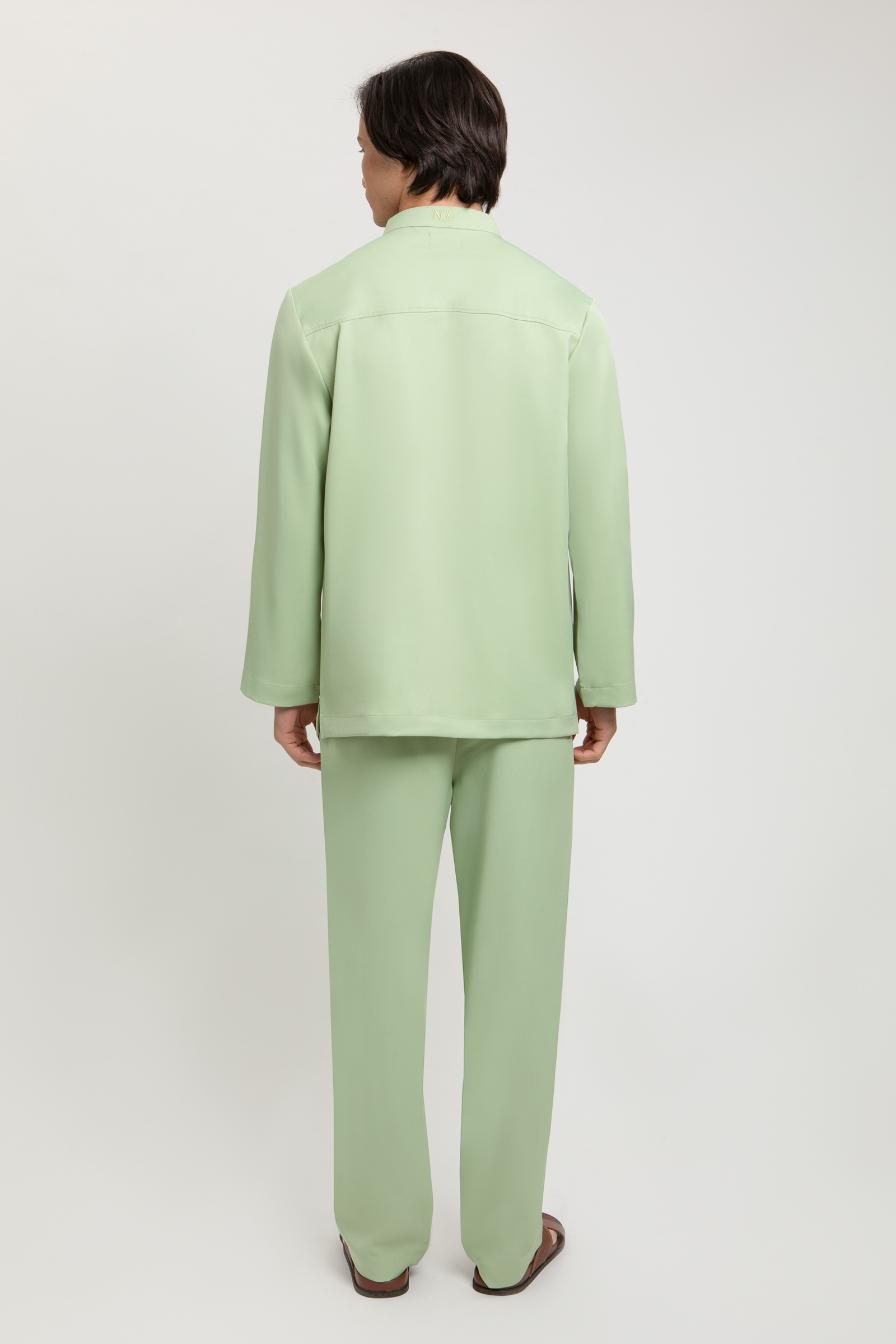 Eshaal Cekak Musang features a refined cekak musang silhouette with 4 signature NOE buttons at the neckline and NOE embroidery on the pocket and back neck. Designed with one pocket and subtle side slits, it is paored with tailored pants featuring a halfway waistband, zip, button fastening and twi side pockets for a timeless, polished look.