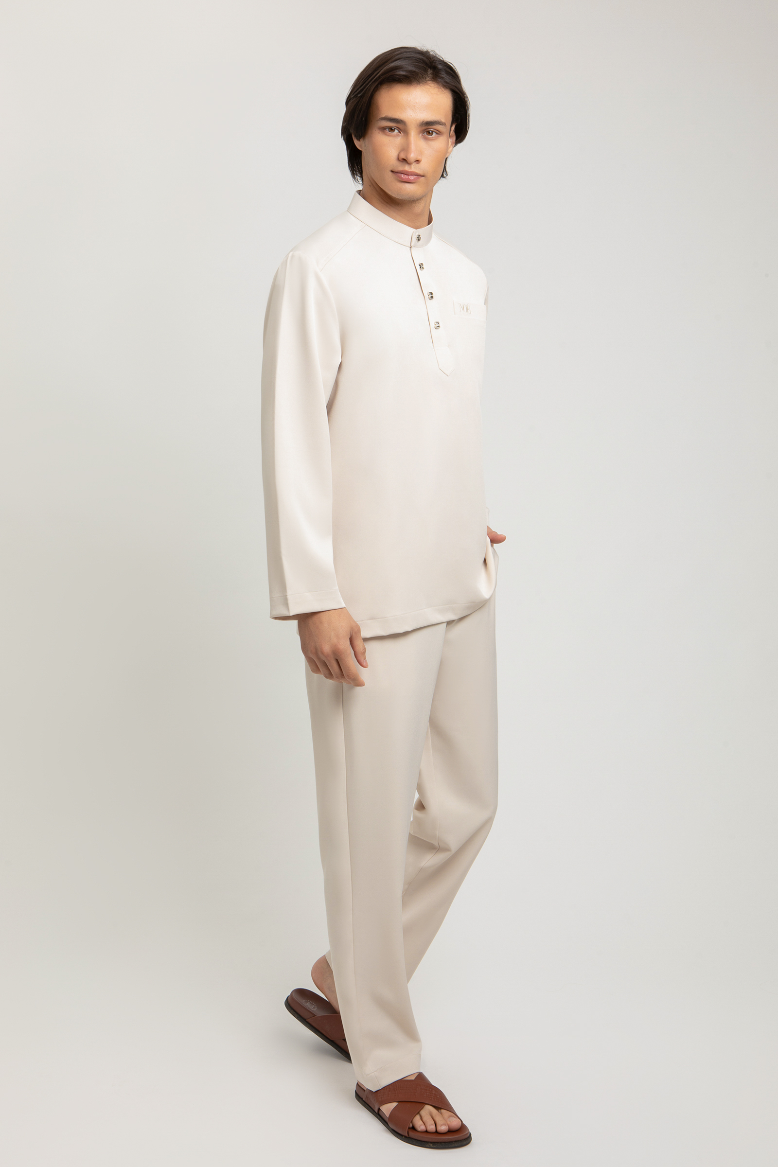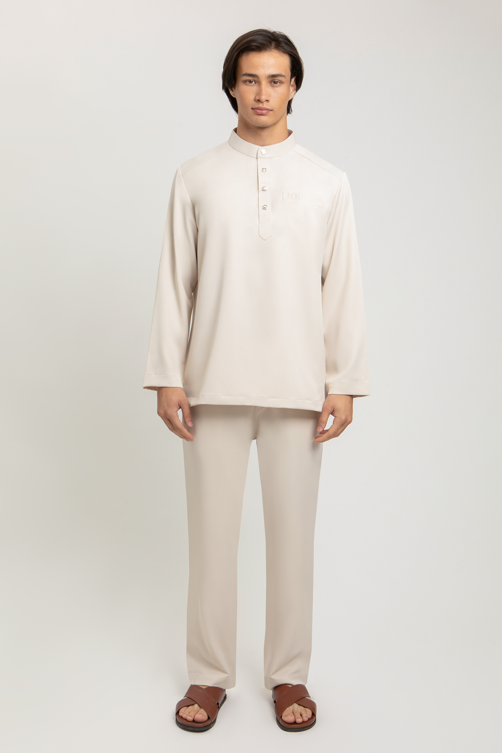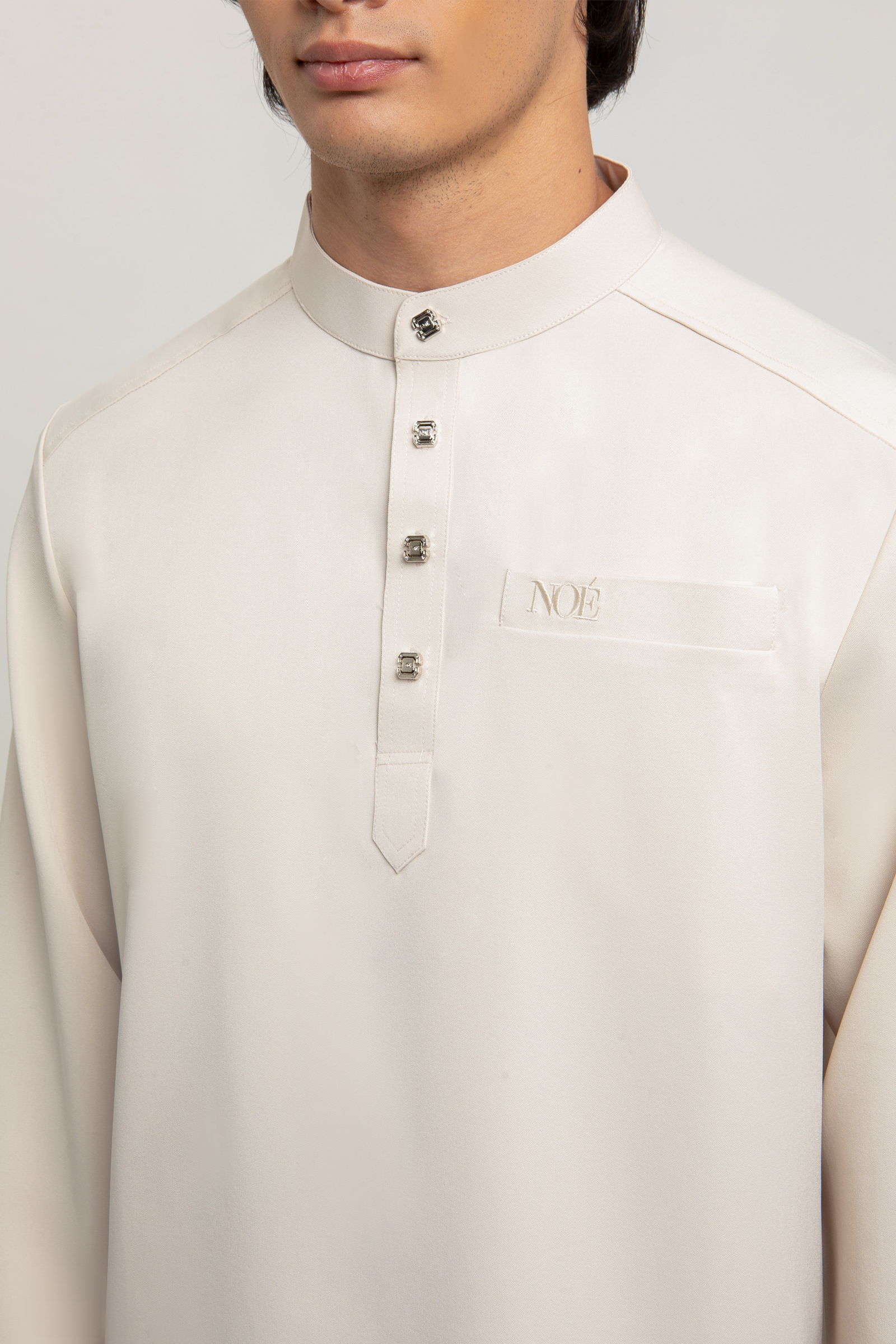 Eshaal Cekak Musang features a refined cekak musang silhouette with 4 signature NOE buttons at the neckline and NOE embroidery on the pocket and back neck. Designed with one pocket and subtle side slits, it is paored with tailored pants featuring a halfway waistband, zip, button fastening and twi side pockets for a timeless, polished look.