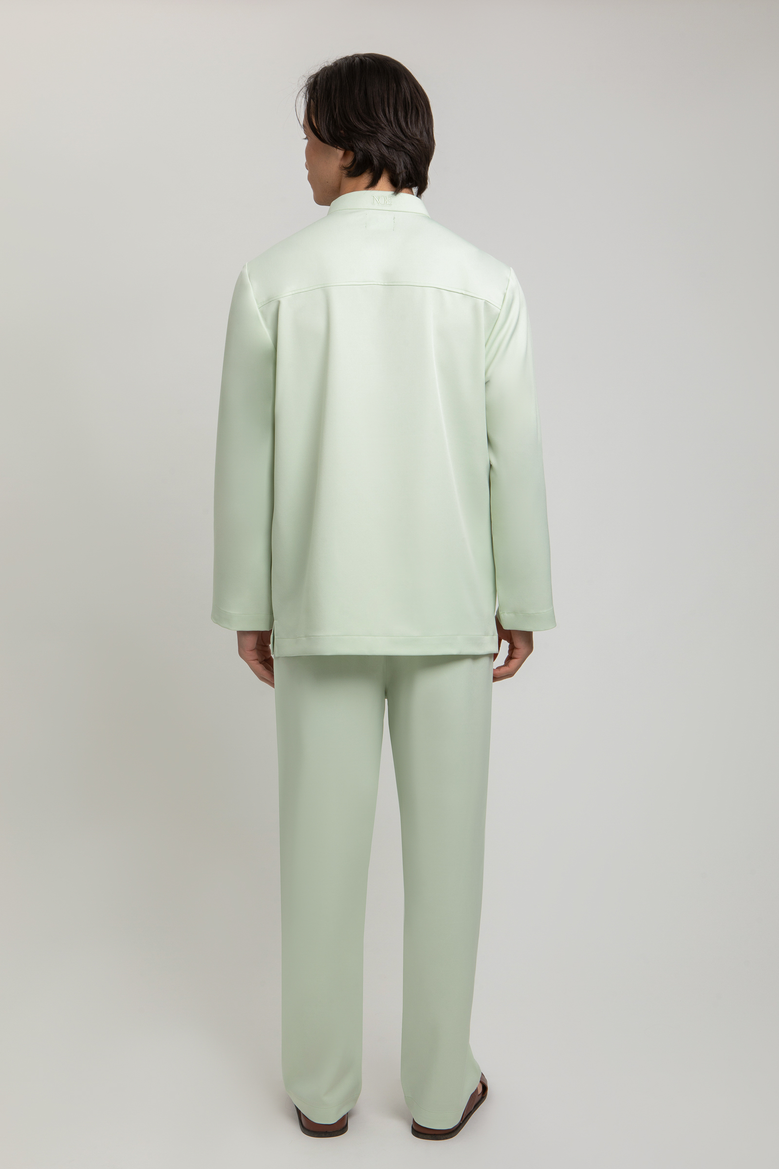 Eshaal Cekak Musang features a refined cekak musang silhouette with 4 signature NOE buttons at the neckline and NOE embroidery on the pocket and back neck. Designed with one pocket and subtle side slits, it is paored with tailored pants featuring a halfway waistband, zip, button fastening and twi side pockets for a timeless, polished look.