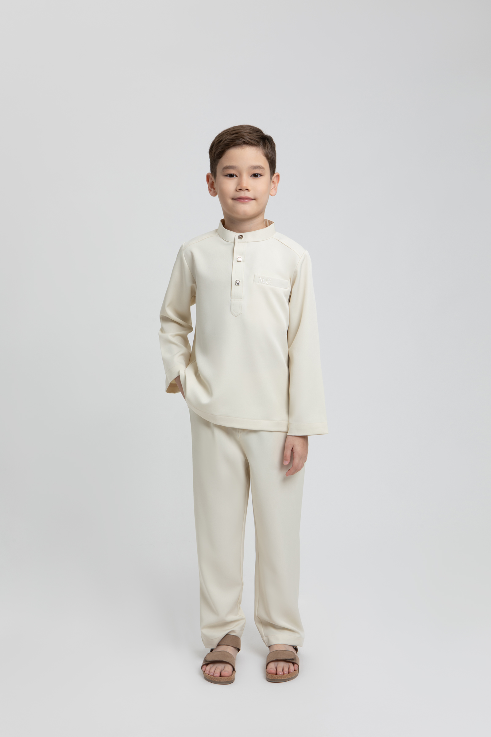 Eshaal Cekak Musang Kids features a refined cekak musang silhouette with 3 signature NOE buttons,NOE embroidery on the pocket and back neck, one pocket subtleside slits Paired with tailored pants featuring a halfway waistband, zip fastening and two side pockets for a polished festive look.