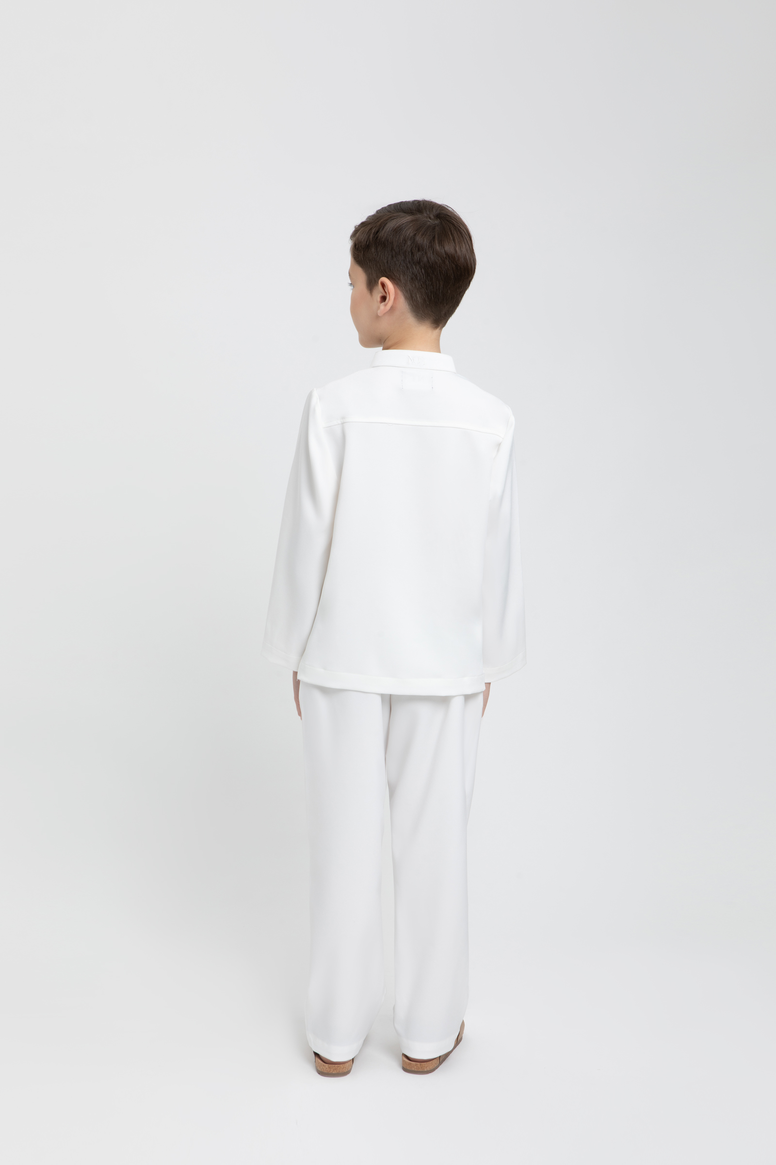 Eshaal Cekak Musang Kids features a refined cekak musang silhouette with 3 signature NOE buttons,NOE embroidery on the pocket and back neck, one pocket subtleside slits Paired with tailored pants featuring a halfway waistband, zip fastening and two side pockets for a polished festive look.