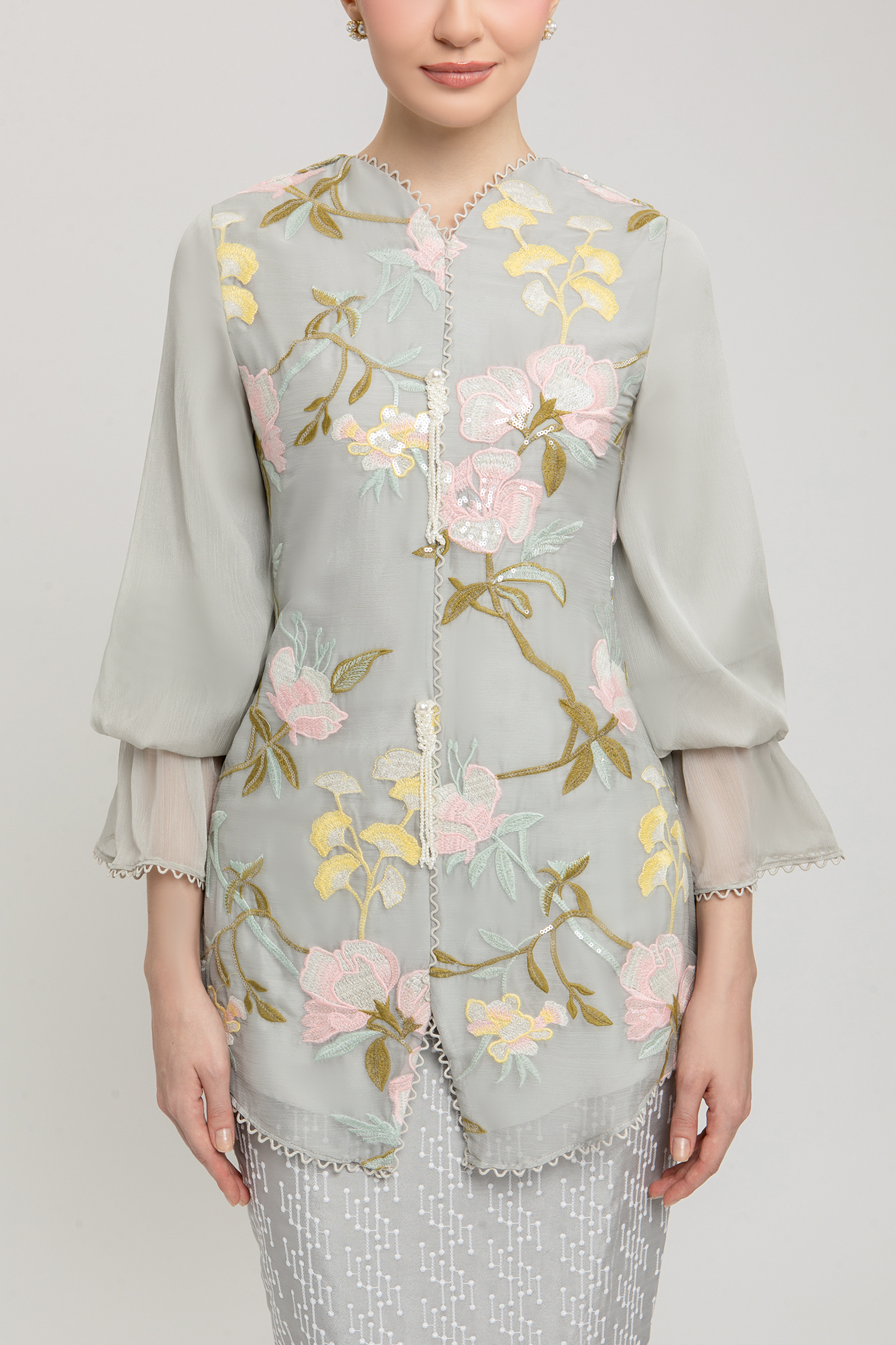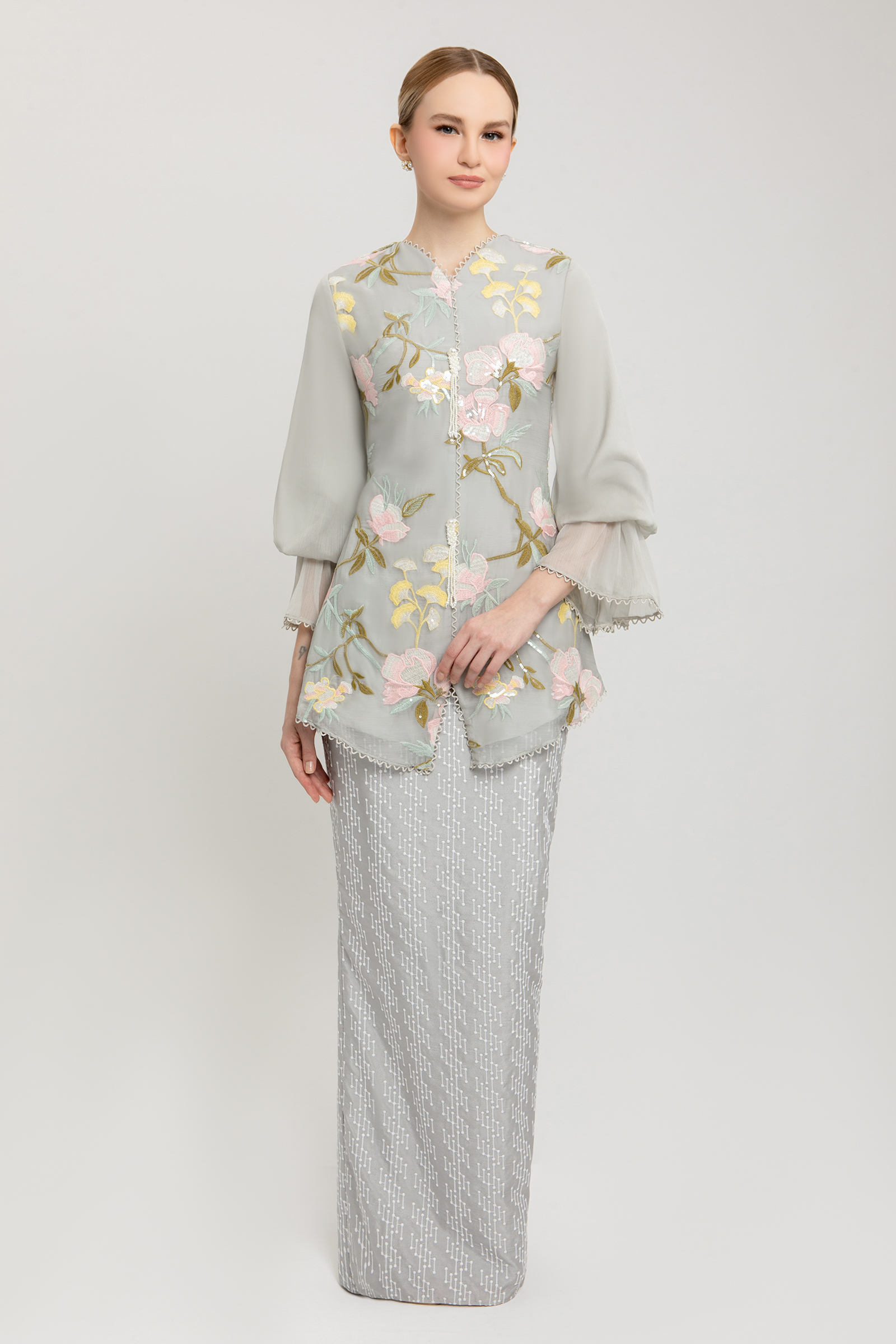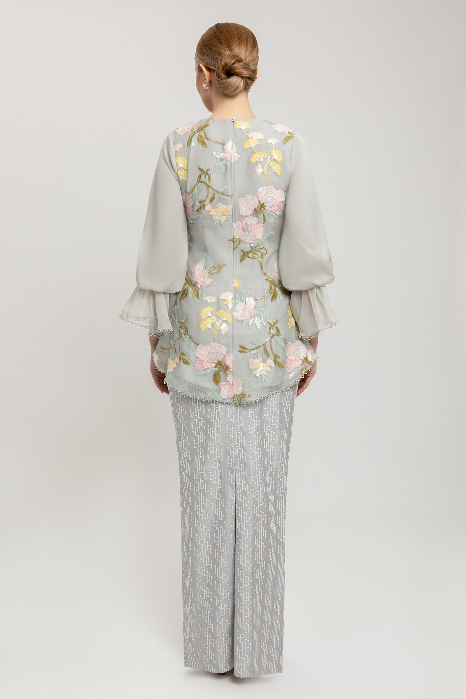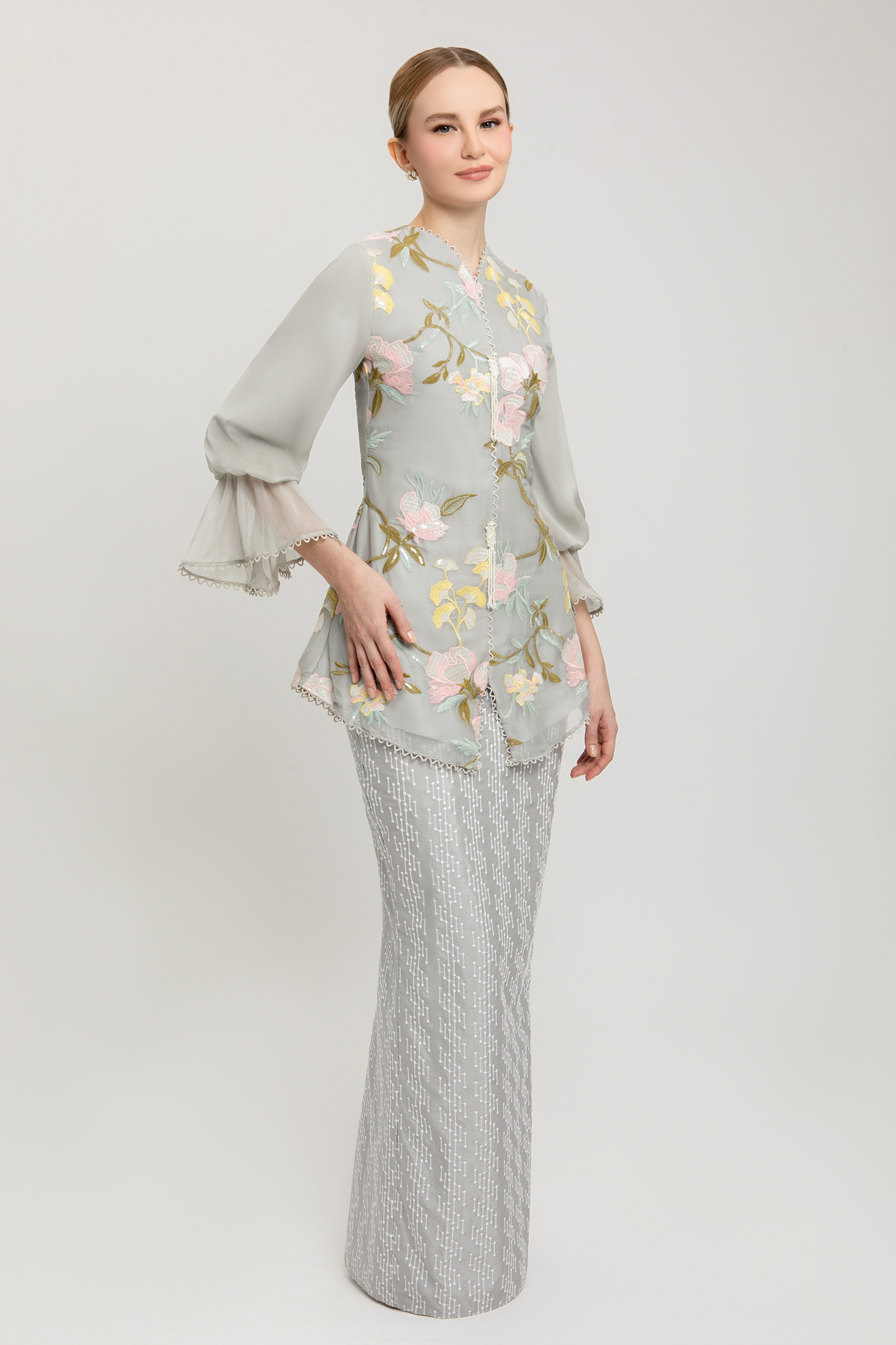 ESMIRA KURUNG crafted from chiffon embroidery with poly blend and full lining, features a V-neck with border lace, 3D custom beading at the centre, puff sleeves with elastic, sequin embroidery embellishments, back darts and back zipper, paired with an embroidery crepe pencil skirt with full embroidery, full lining, back zipper. back pleat, and halfway elastic waistband.