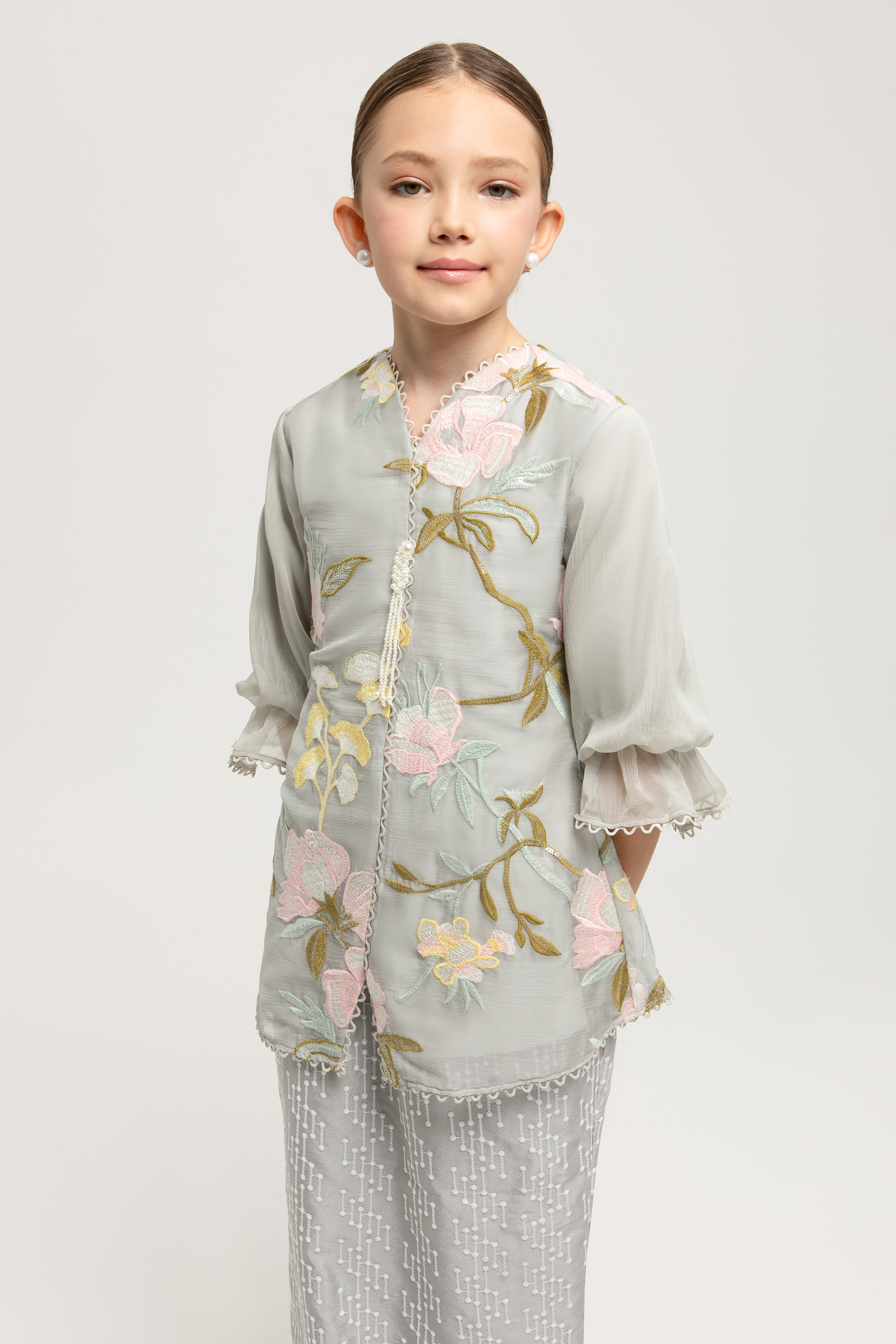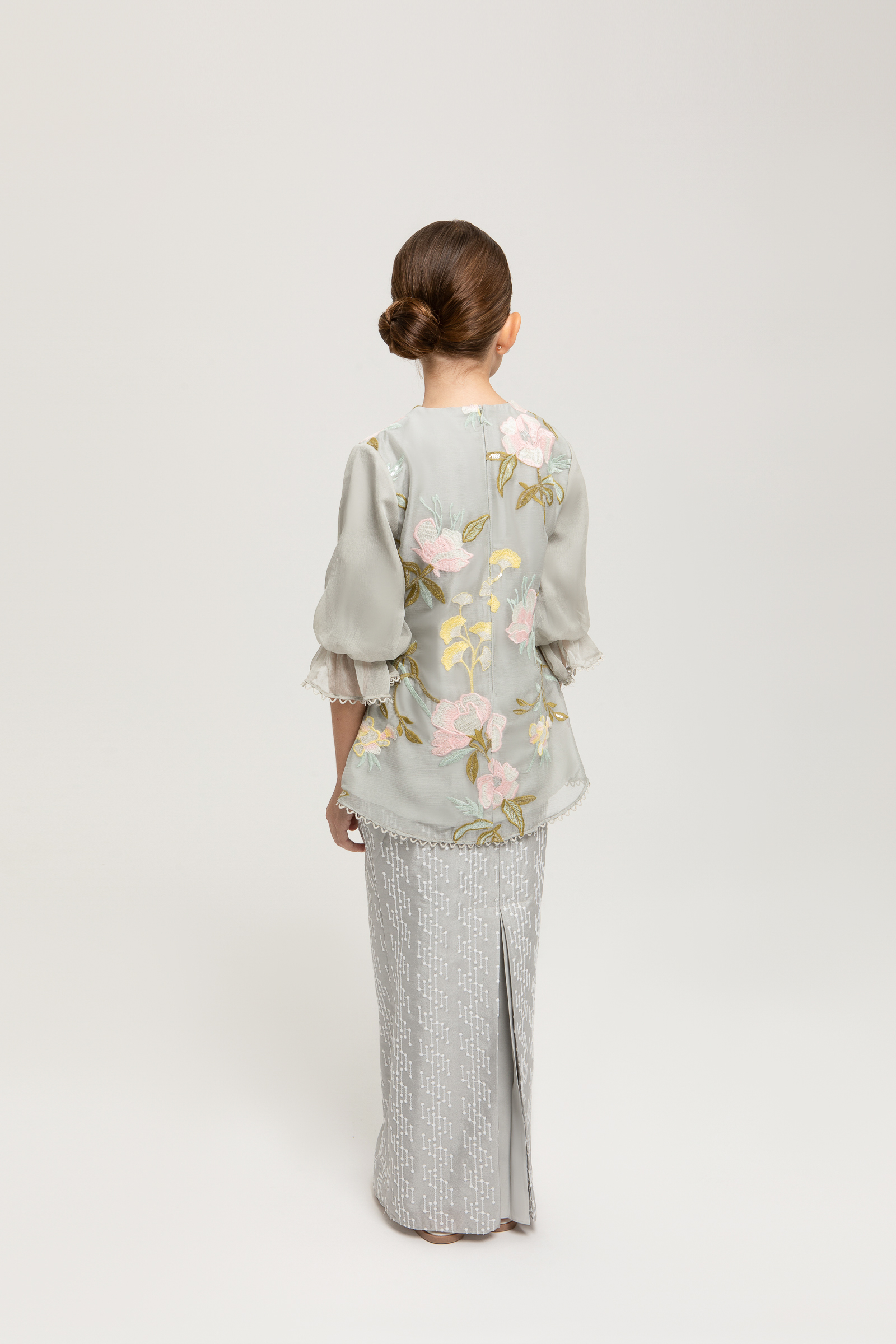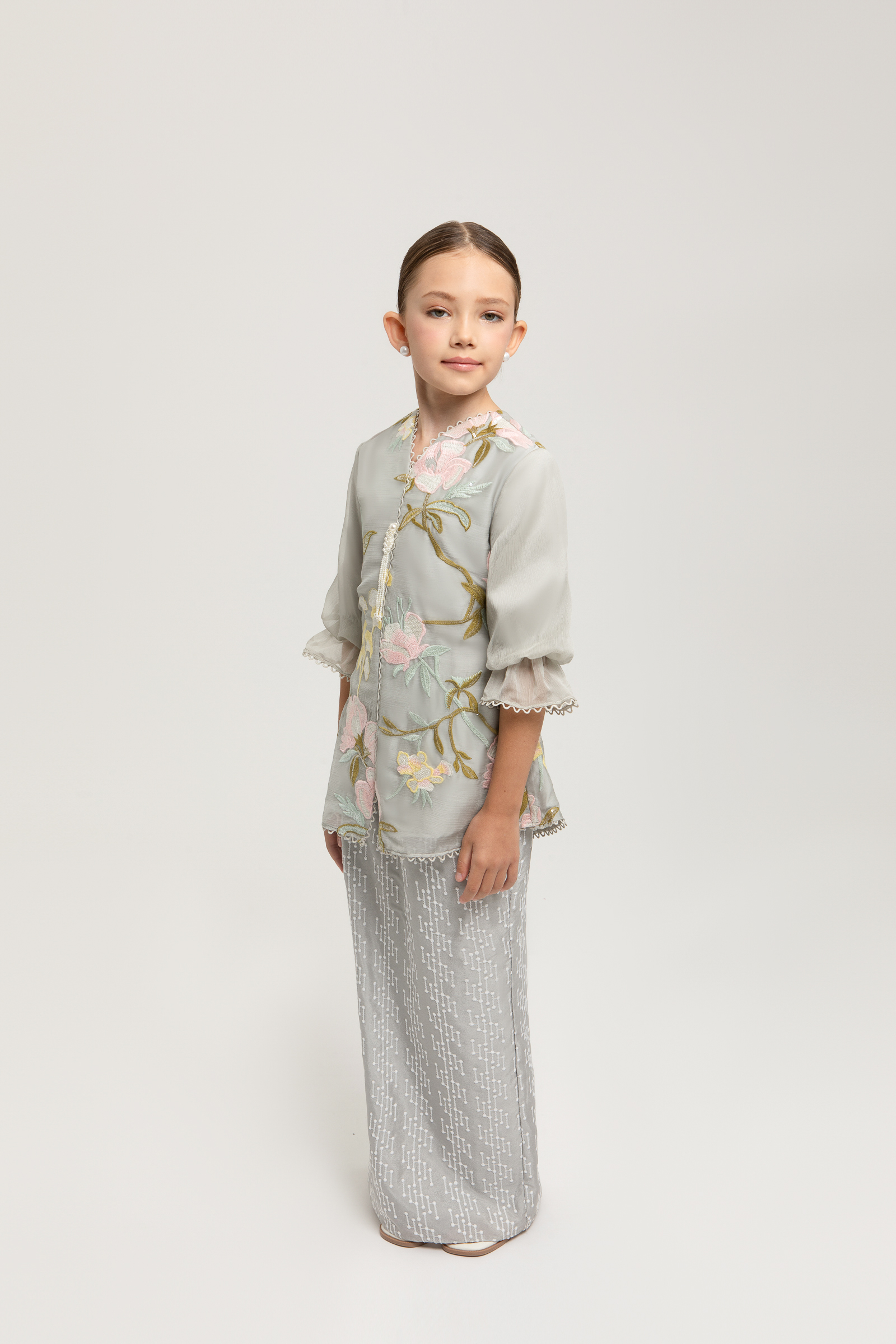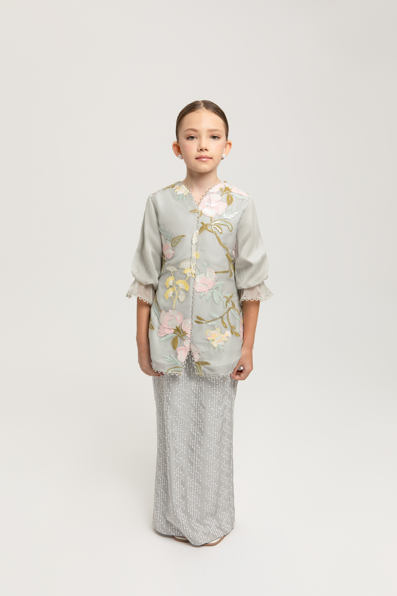 ESMIRA KURUNG KIDS crafted from chiffon embroidery with poly blend and full lining, features a V-neck with border lace, 3D custom beading at the centre, puff sleeves with elastic, sequin embroidery embellishments, back darts and back zipper, paired with an embroidery crepe pencil skirt with full embroidery, full lining, back zipper, back pleat, and full elastic waistband.