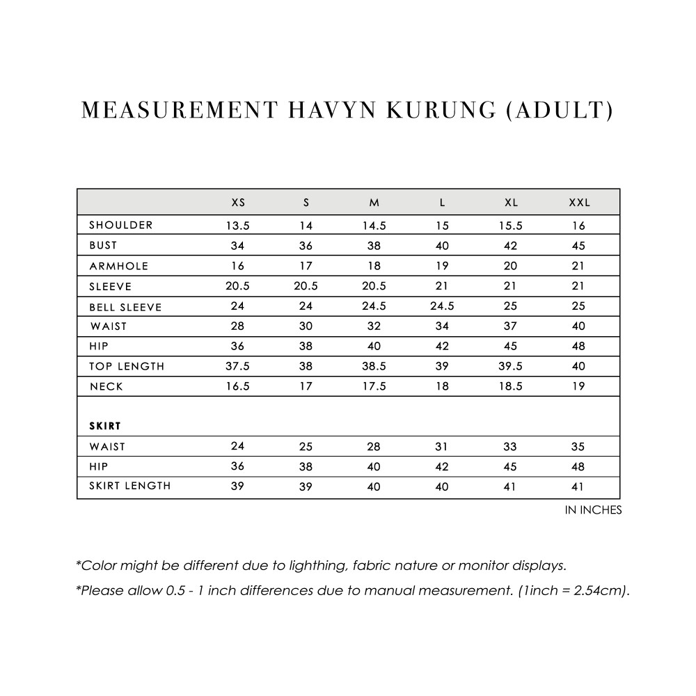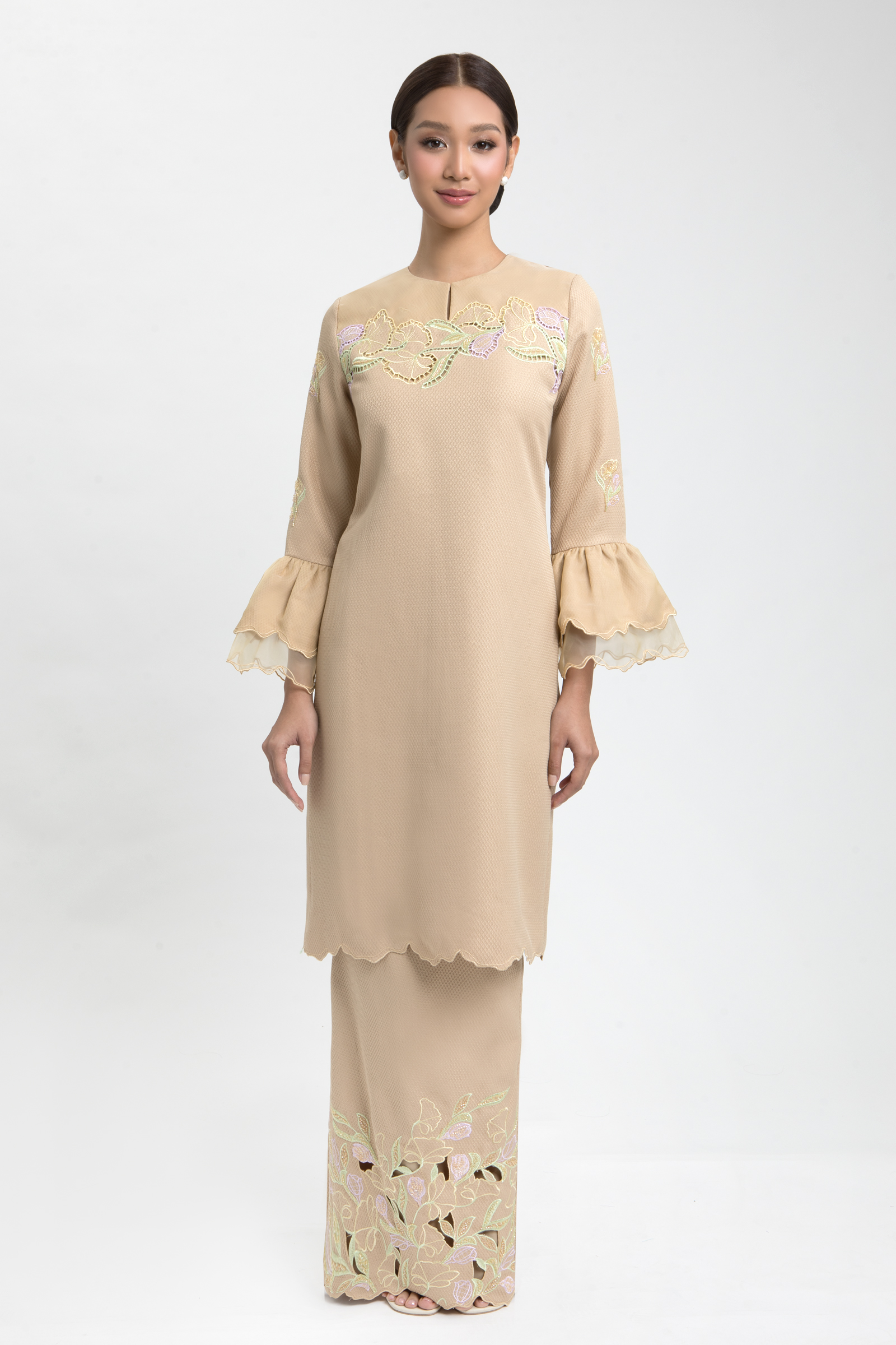 HAVYN KURUNG crafted from jacquard cotton blend, features a round neckline with floral embroidery and beading on transparent organdy, embroidered hem, flared ruffle edges, soft gathered and sheer organza details, with floral accents on sleeves and back zipper, paired with a matching skirt with halfway elastic waistband, back pleats, front Aritachi layer, and floral embroidery with beading on hem.