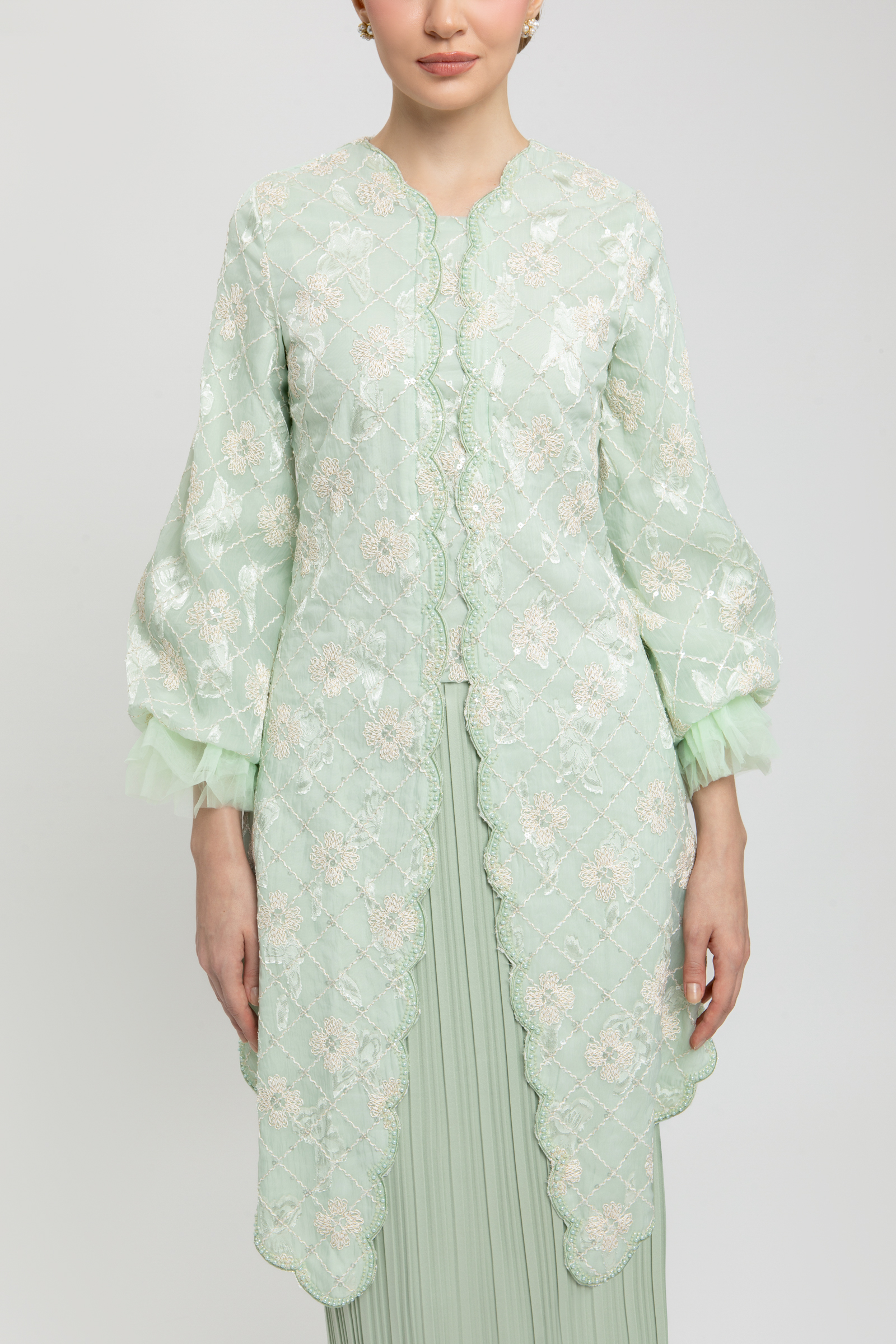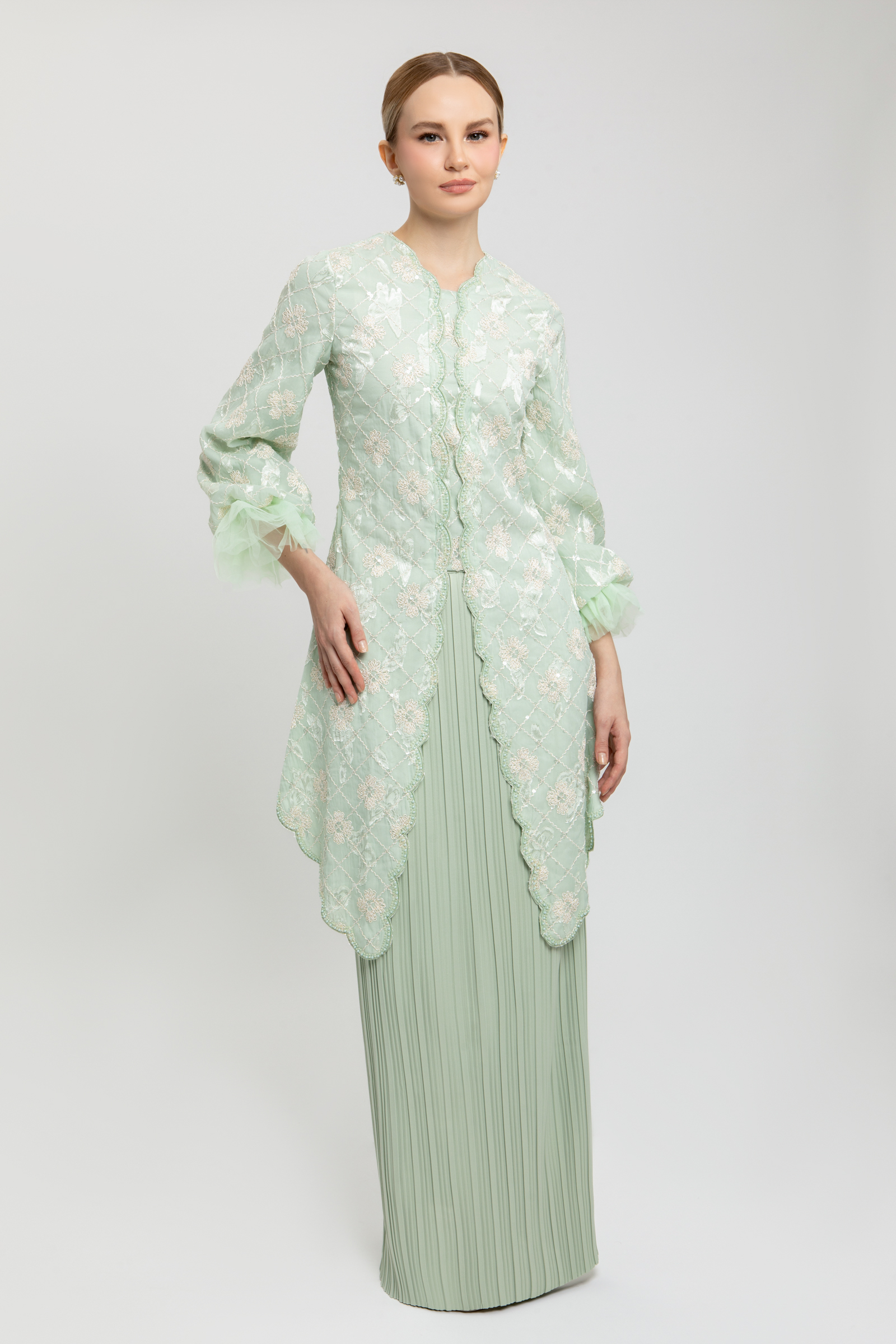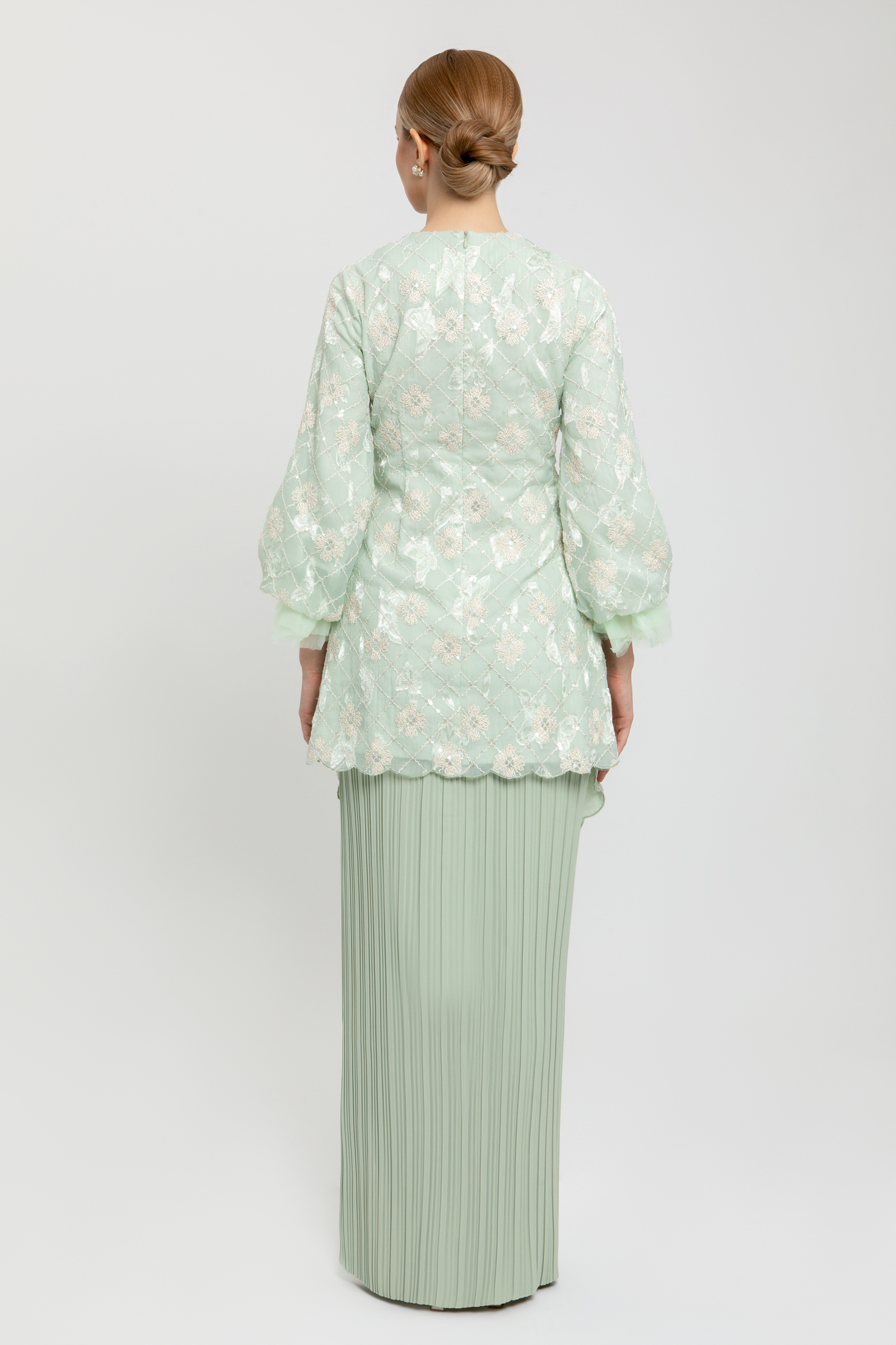 LEONDRA KURUNG crafted from embroidered organdy with sequins and poly blend, fully lined, features a V-neck with embroidered edge, embroidered hem, beaded centre, puff sleeves with elastic net, back darts, back zipper, and embroidery embellishment, paired with a poly blend pleated pencil skirt with back zipper, back pleat, and halfway elastic waistband.