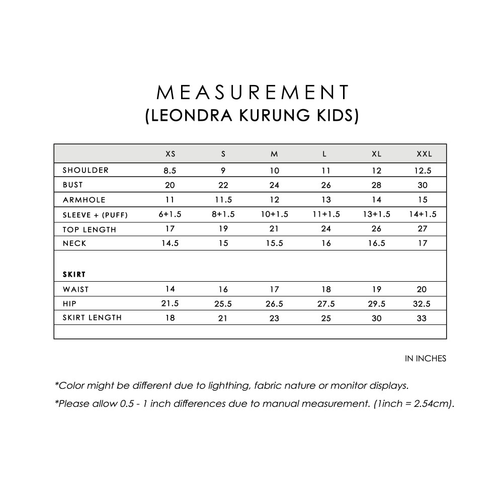 LEONDRA KURUNG KIDS crafted from embroidered organdy with sequins and poly blend, fully lined, features a V-neck with embroidered edge, embroidered hem, beaded centre, puff sleeves with elastic net, back darts, back zipper, and embroidery embellishment, paired with a poly blend pleated pencil skirt with back zipper, back pleat, and full elastic waistband.
