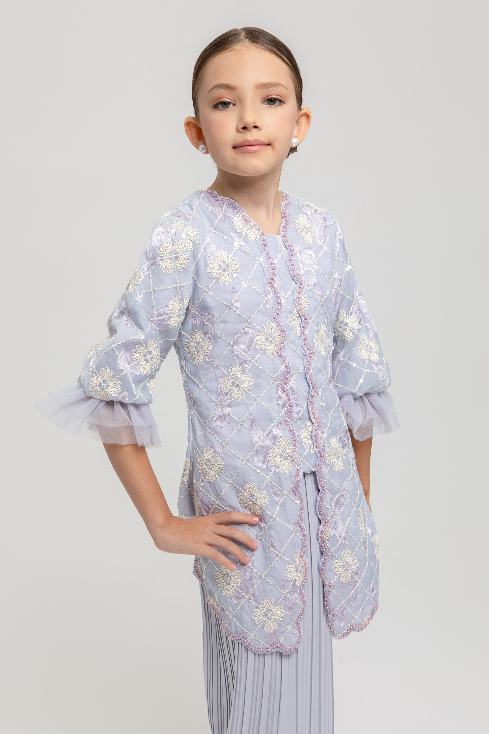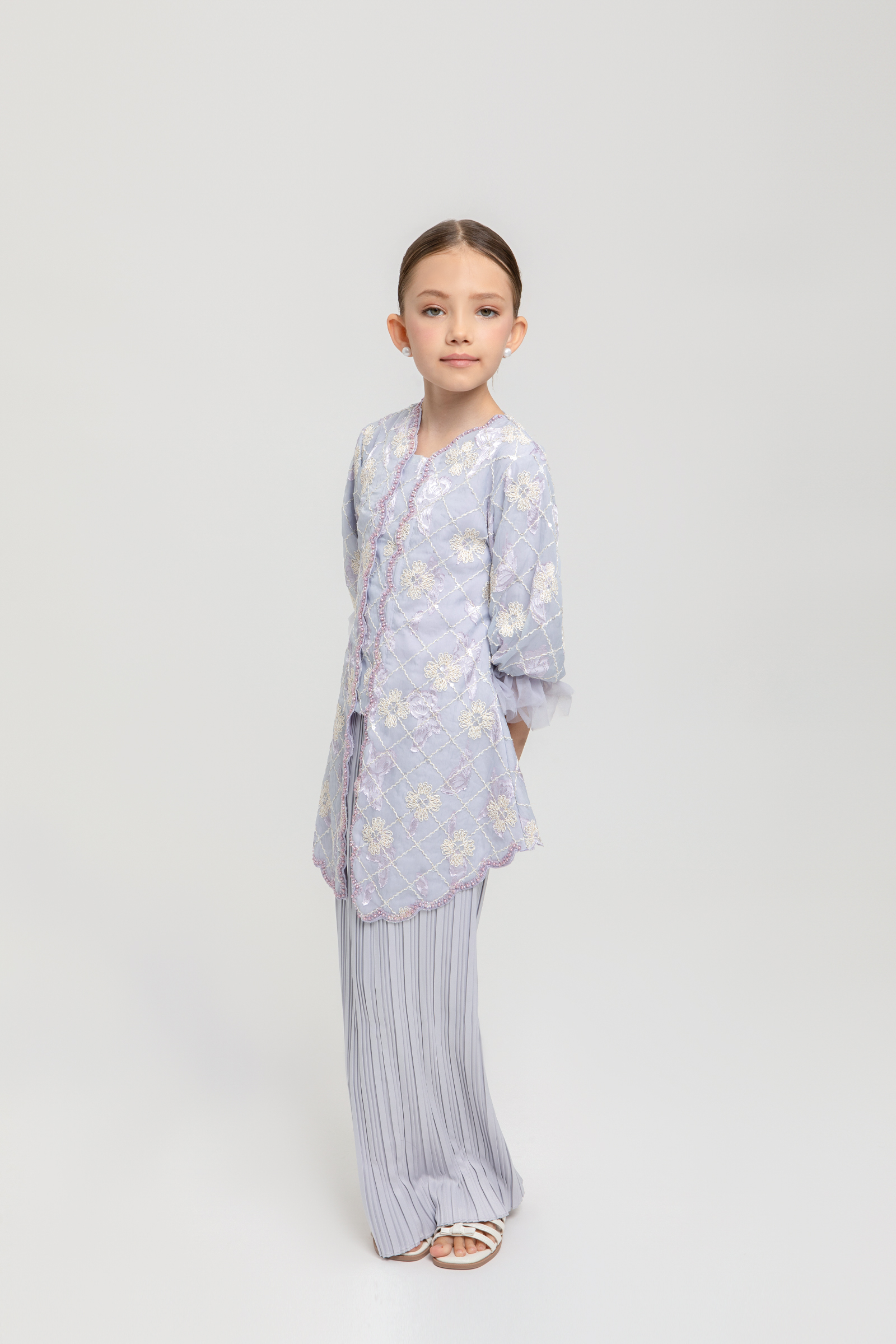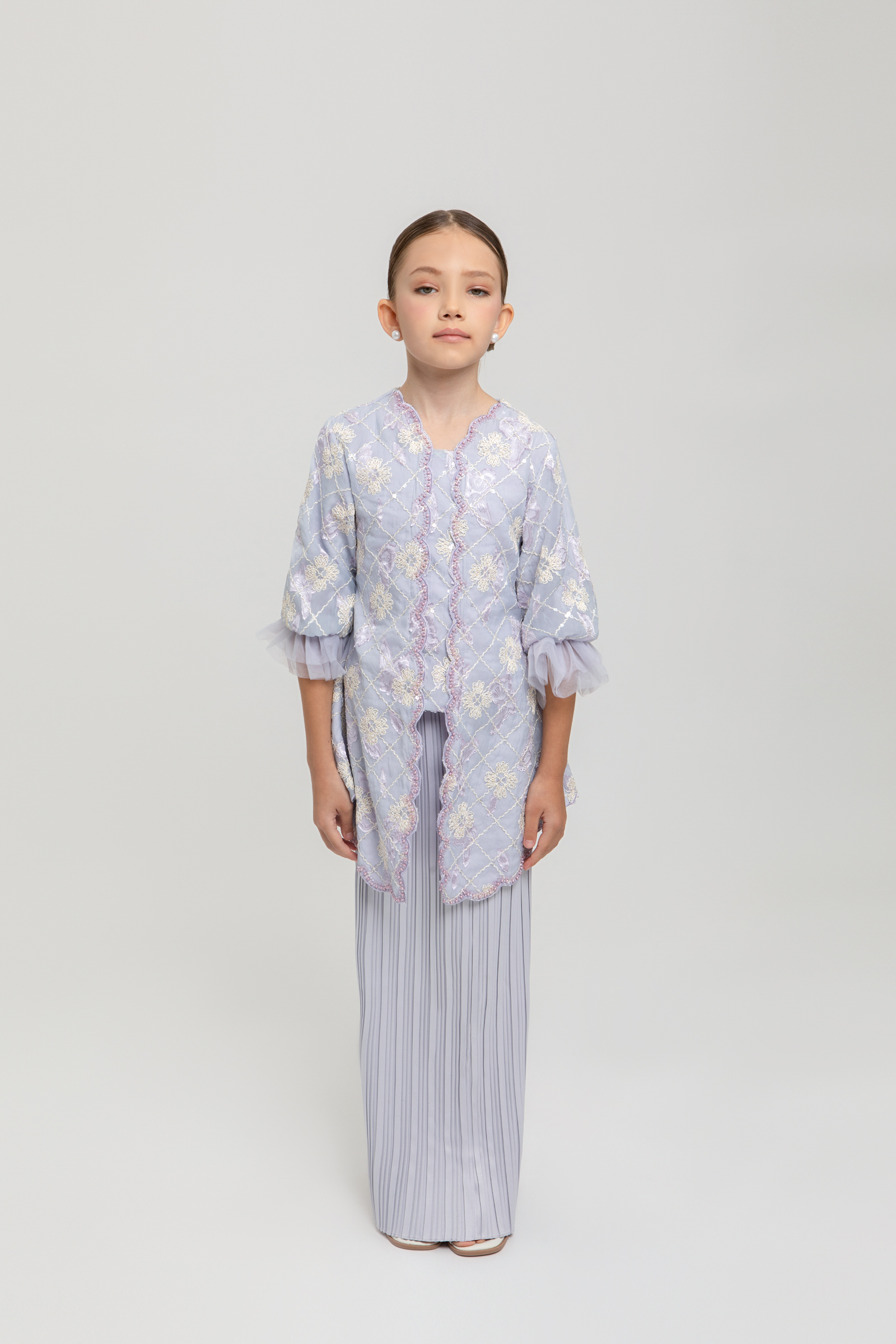 LEONDRA KURUNG KIDS crafted from embroidered organdy with sequins and poly blend, fully lined, features a V-neck with embroidered edge, embroidered hem, beaded centre, puff sleeves with elastic net, back darts, back zipper, and embroidery embellishment, paired with a poly blend pleated pencil skirt with back zipper, back pleat, and full elastic waistband.