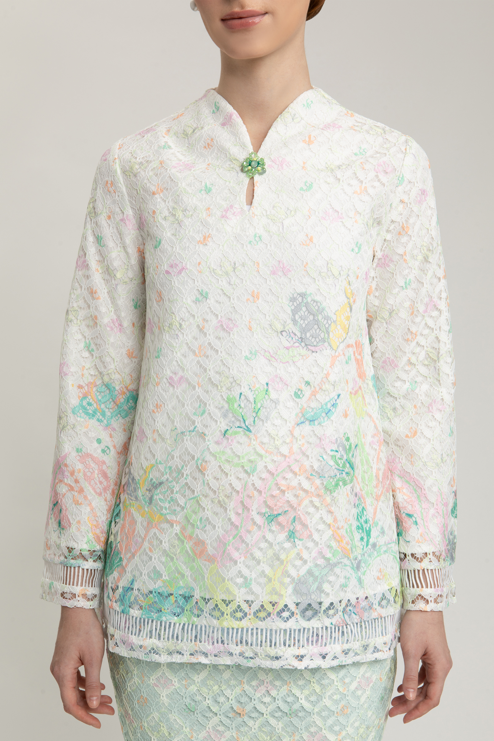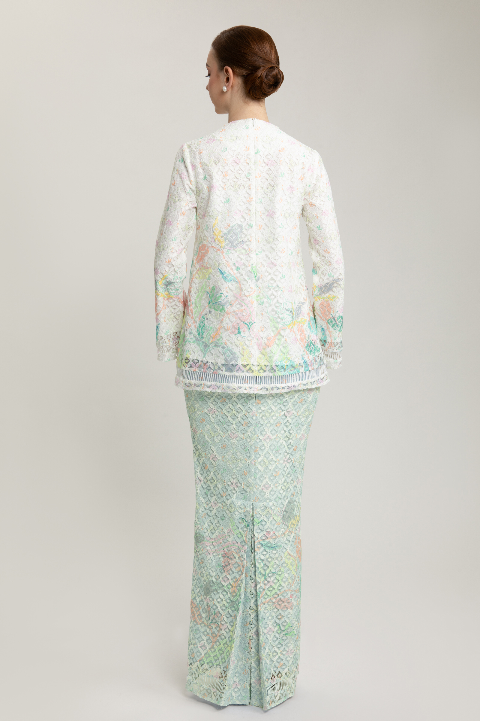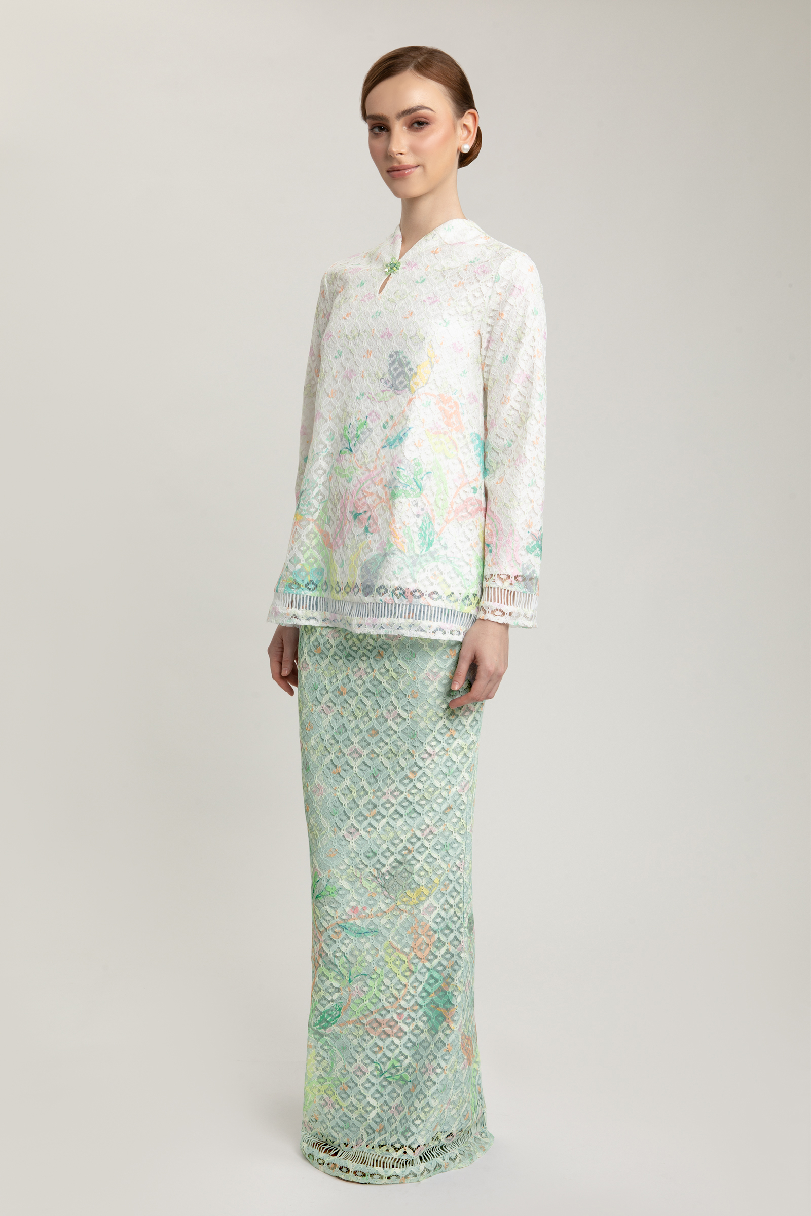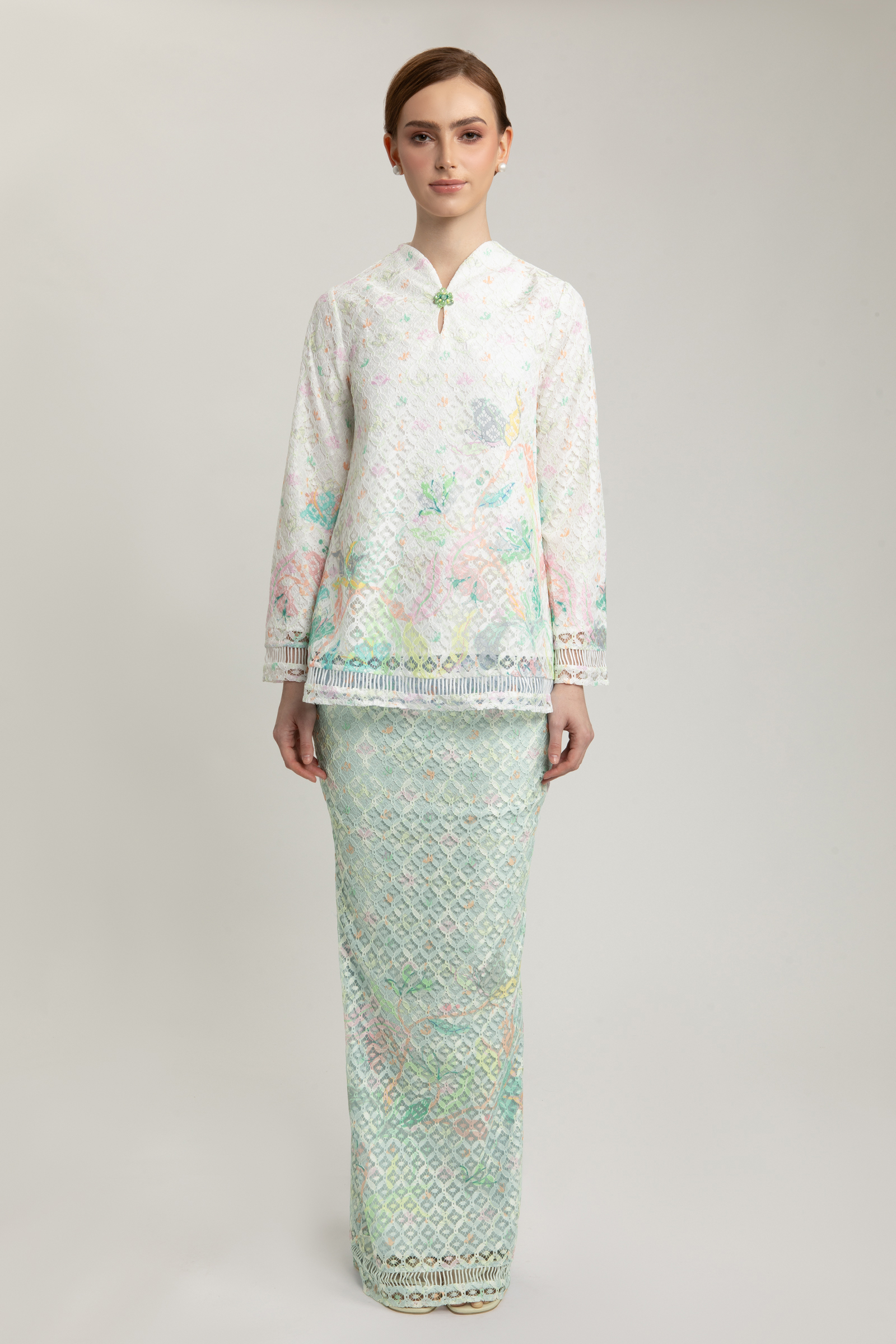 Step into refined elegance with the Moira Kurung, a graceful ensemble that celebrates timeless femininity. The top is delicately crafted from printed guipure lace, layered over soft Ari Tachi lining, and designed with a flattering V-neckline. Ladder detailing along the top and sleeves adds a touch of texture, while a charming brooch at the neckline lends a hint of vintage allure. A concealed back zipper ensures a seamless finish.
