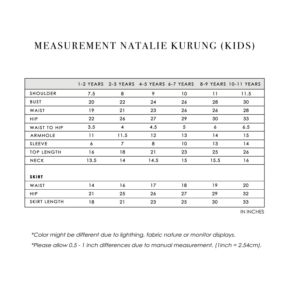NATALIE KURUNG KIDS crafted from shantung with metallic sheen finishing fabric with front poly cotton blend top, features a V-neckline with embroidery and front yoke lace, puffed sleeves with gathered lace lining and tassel details, embroidered wrist, layered front beading and back slit, completed with a back zipper, paired with a matching shantung skirt with full elastic waistband and back pleats