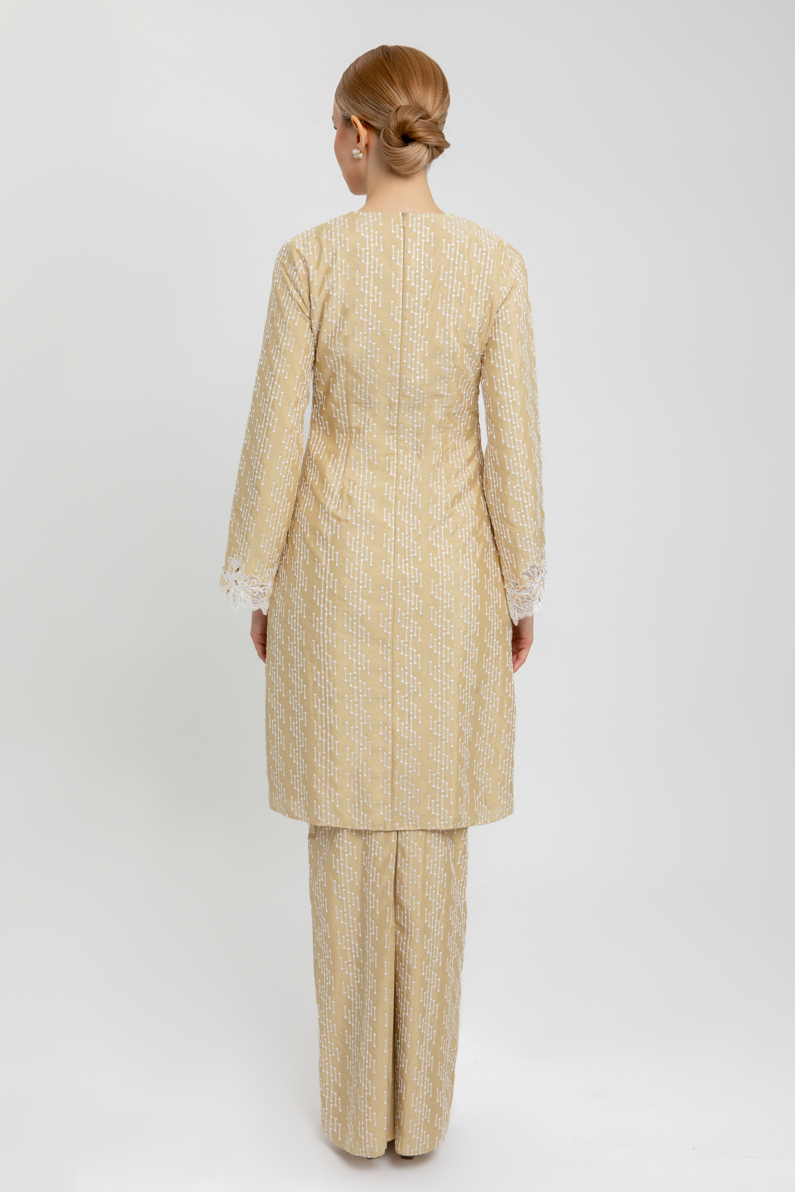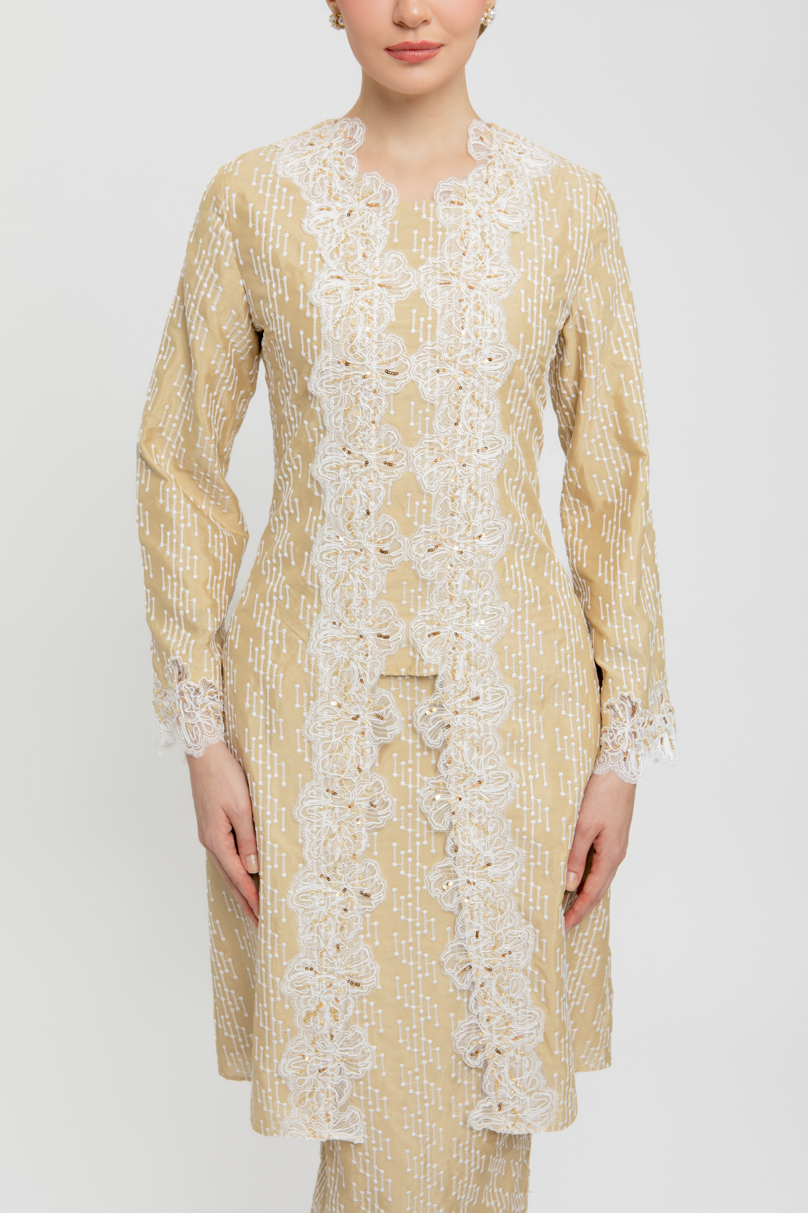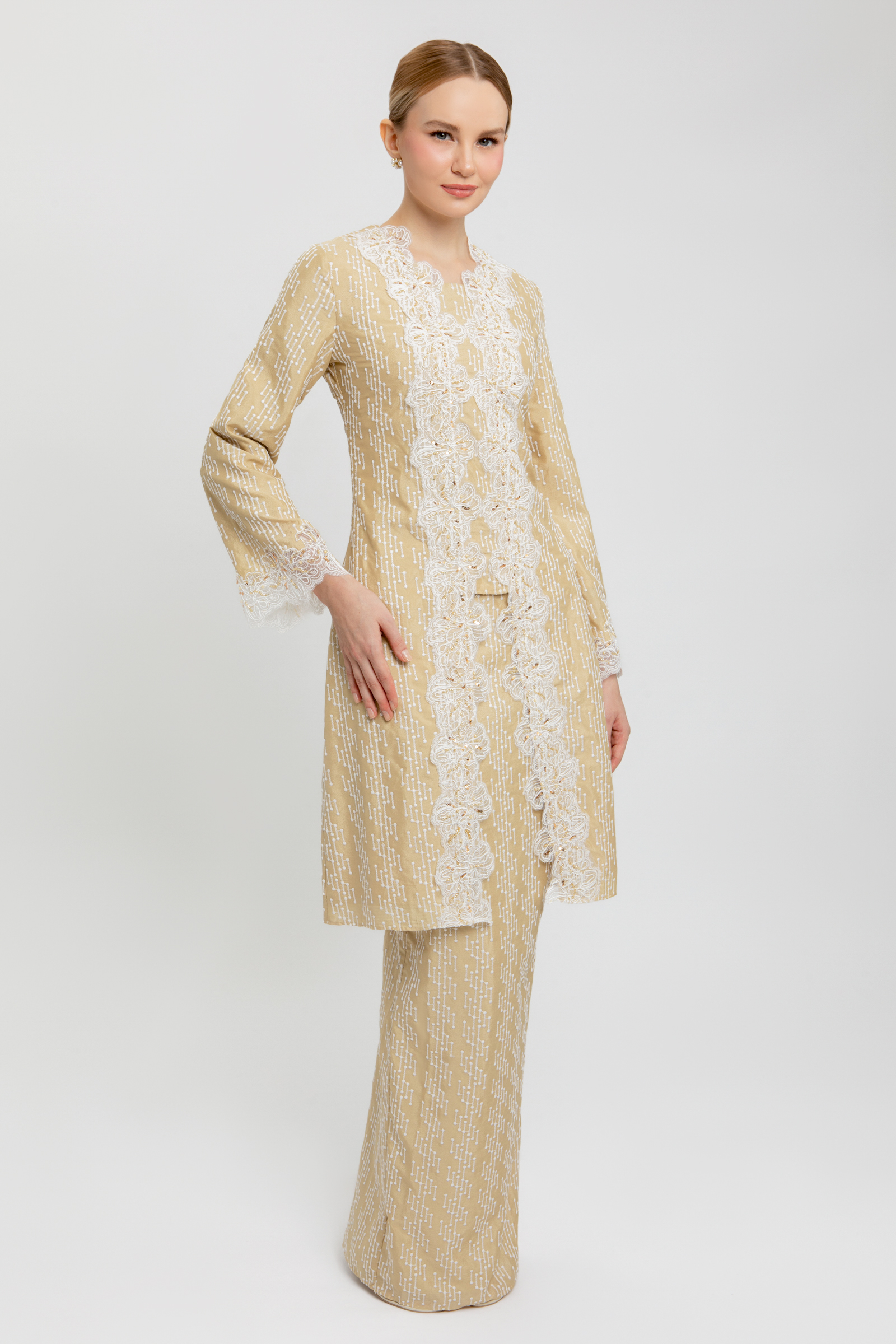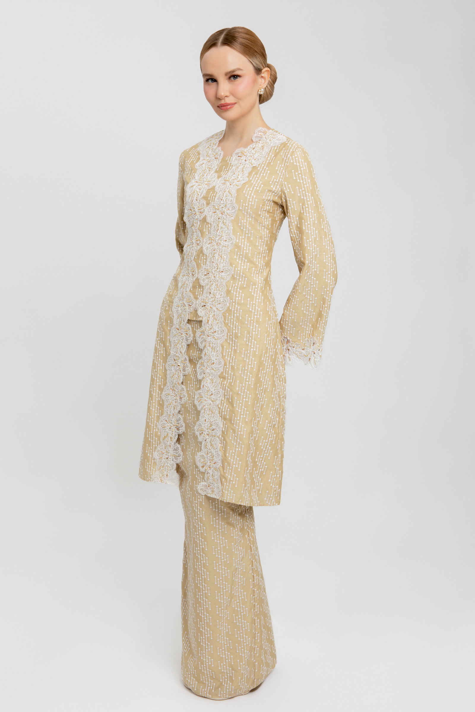 NORYX KURUNG crafted from satin embroidery, features a square neckline with full embroidery, lace beaded detailing at the centre, beaded lace sleeves, and back zipper. paired with a matching satin embroidery pencil skirt with full embroidery, back zipper, back pleat, and halfway elastic waistband.