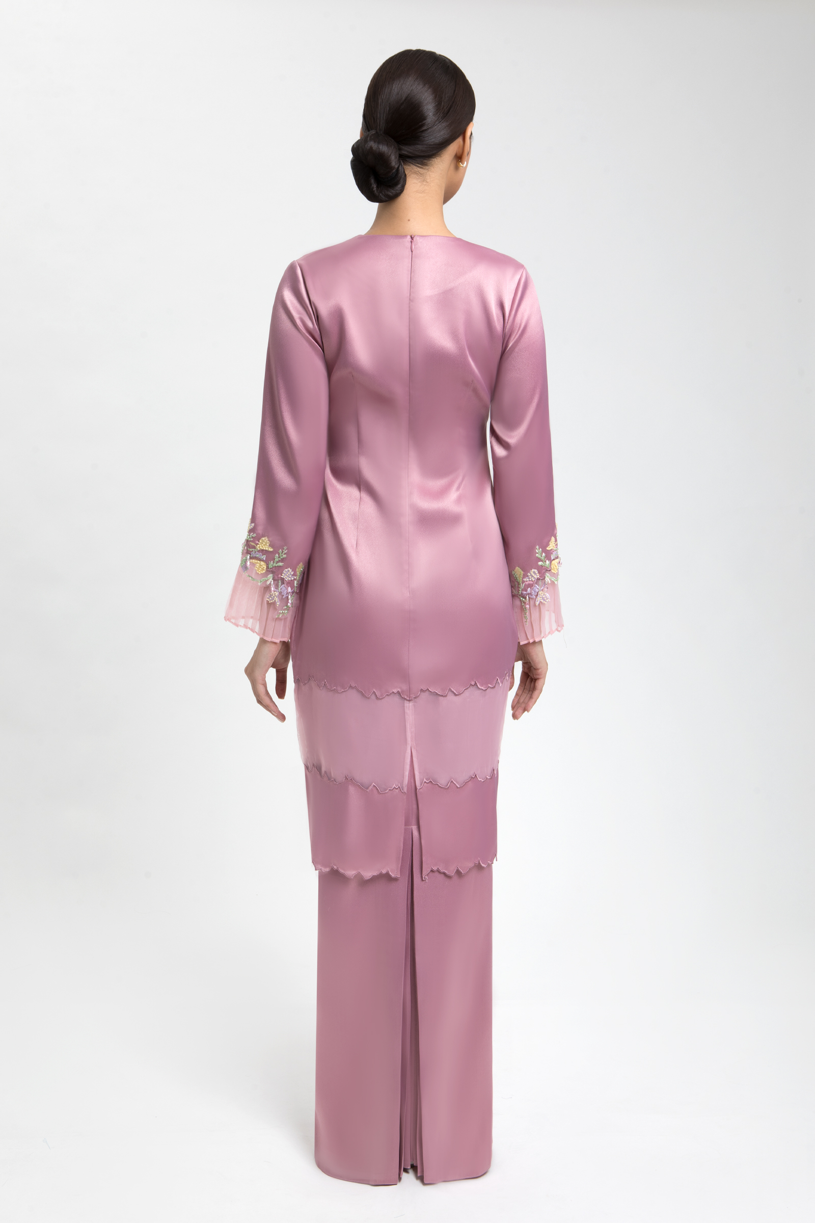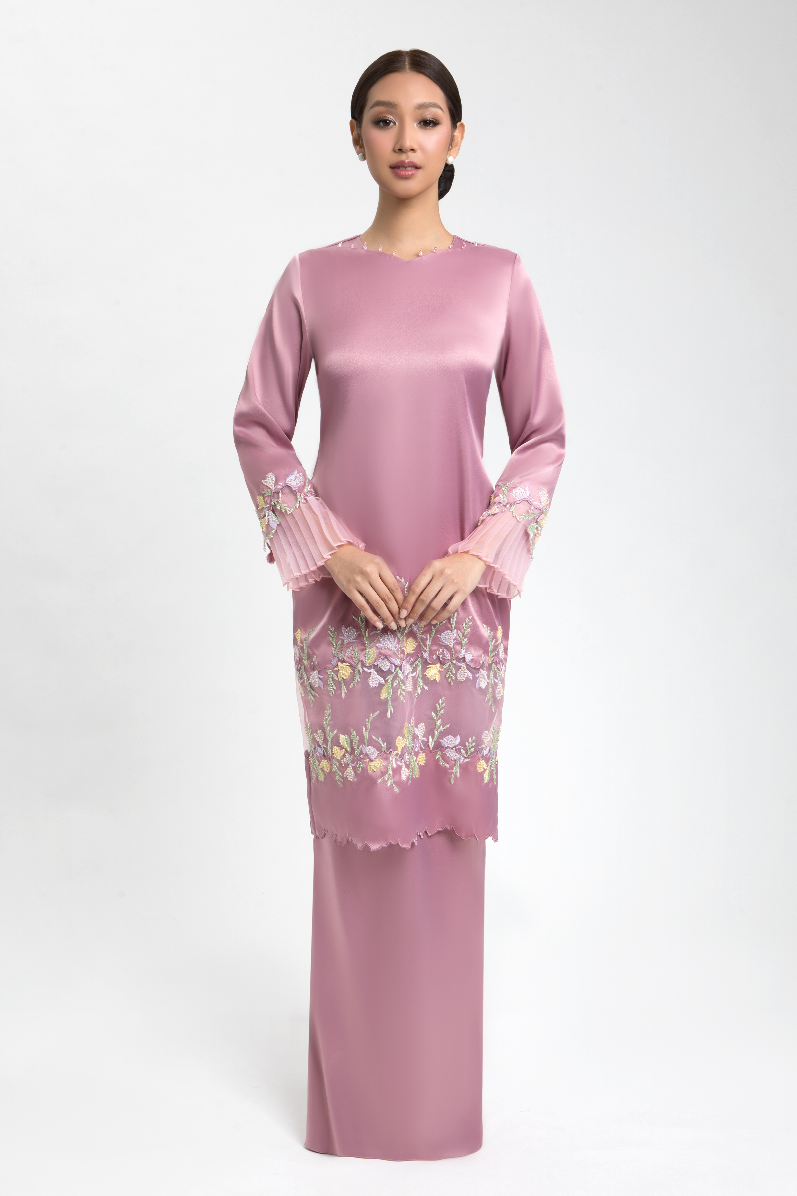 ODELIA KURUNG crafted from satin crepe fabric, features a V neckline with beaded detailing, embellished front body with transparent organdy accents and sleeves finished with pleated organdy layers and embroidery edging with beading,completed with a back zipper and back slit paired with matching satin crepe skirt with a halfway elastic waistband, back pleats and back zipper.