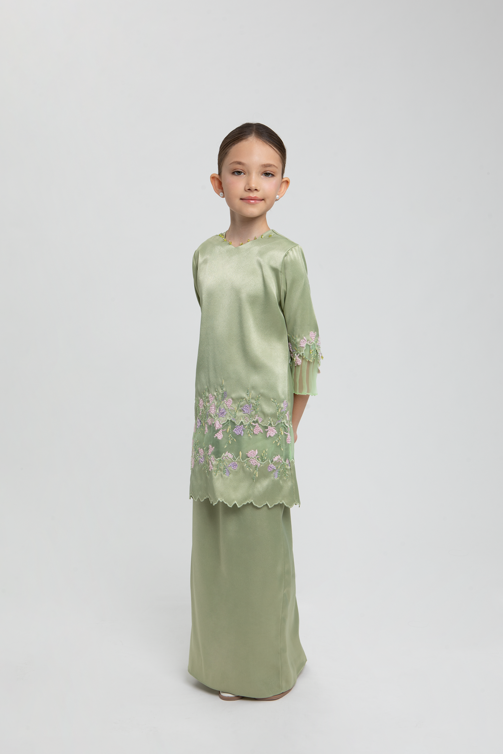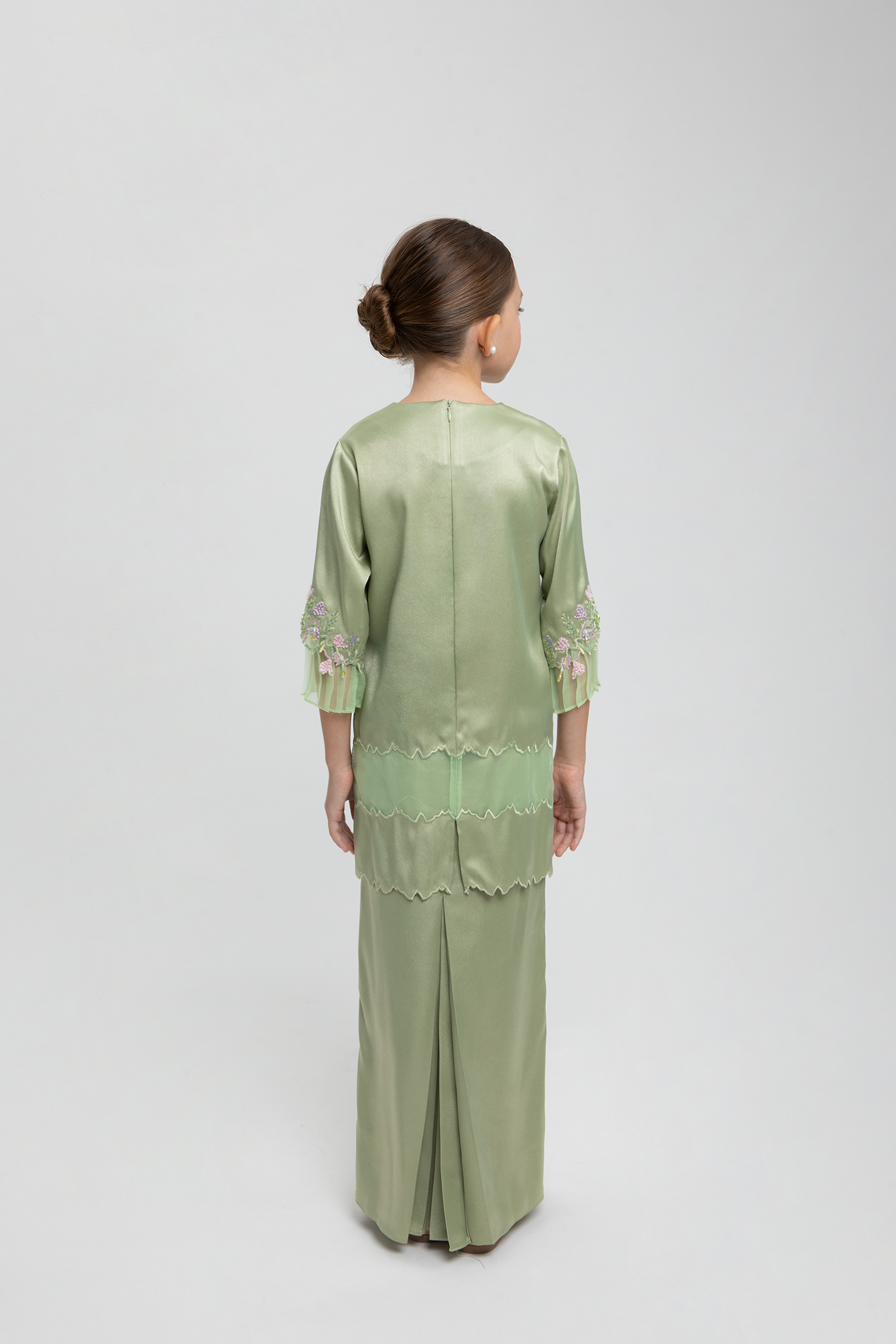 ODELIA KURUNG KIDS crafted from satin crepe fabric, features a V-neckline with beaded detailing, embellished front body with transparent organdy accents and sleeves finished with pleated organdy layers and embroidery edging with beading, completed with a back zipper and back slit, paired with a matching satin crepe skirt with a full elastic waistband and back pleats.