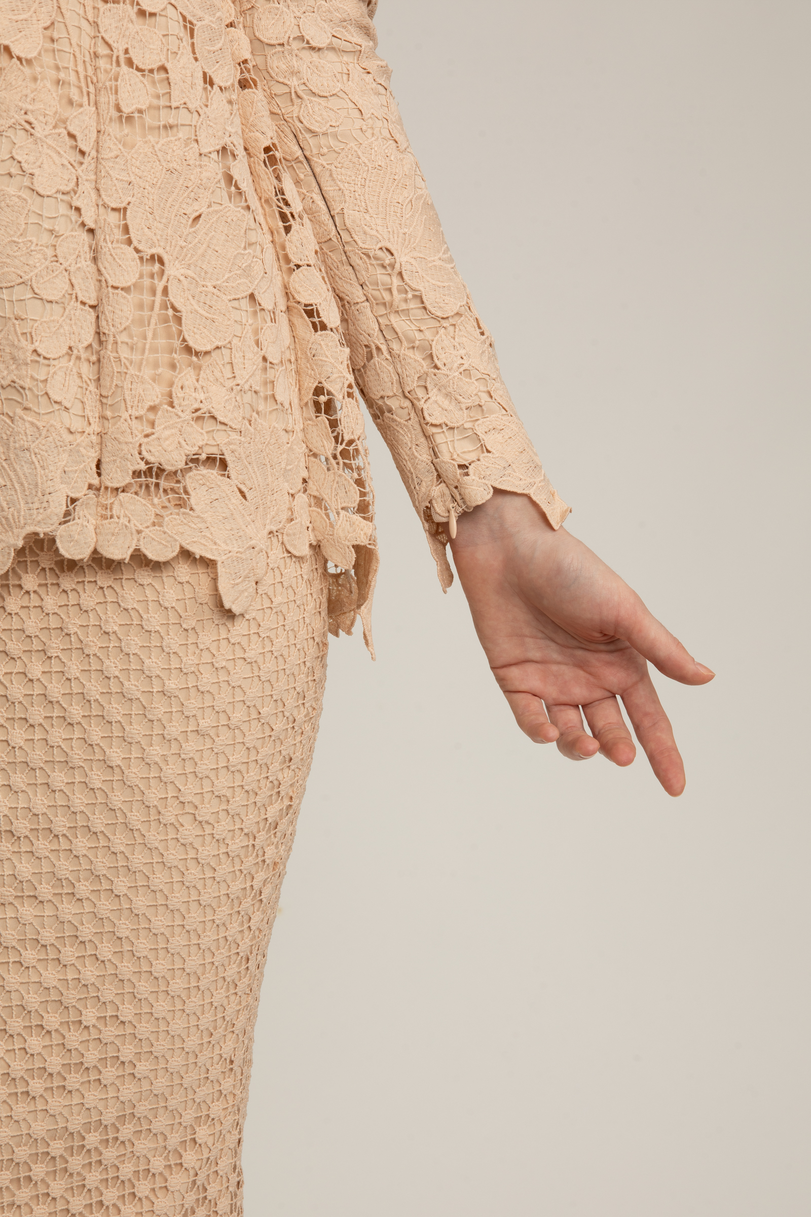 Paired with a geometric guipure lace skirt, Rylie flows with quiet confidence. Its back pleats and halfway waistband sculpt a poised silhouette, designed for movement and elegance in equal measure.