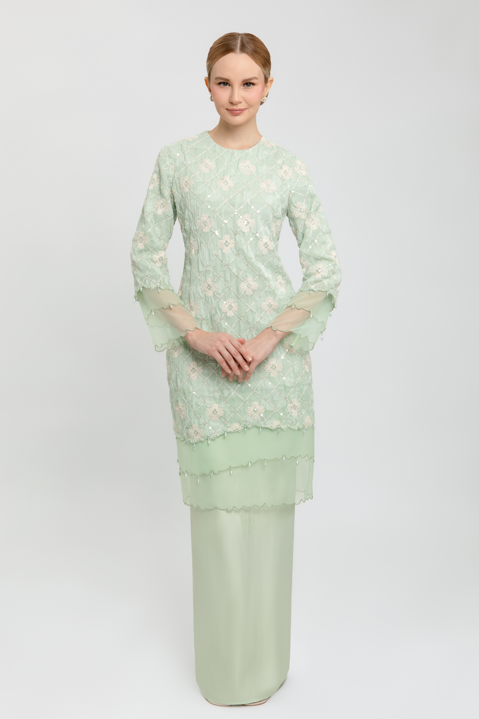 SAFIRA KURUNG crafted from embroidered organdy with sequins and poly blend, fully lined, features a round neckline with beaded embellishment at the front body, embroidered edge hem on top and sleeves, layered transparent organdy with beading on sleeves and front, back darts and back zipper, paired with a satin crepe pencil skirt with full pleats, back zipper, and halfway elastic waistband