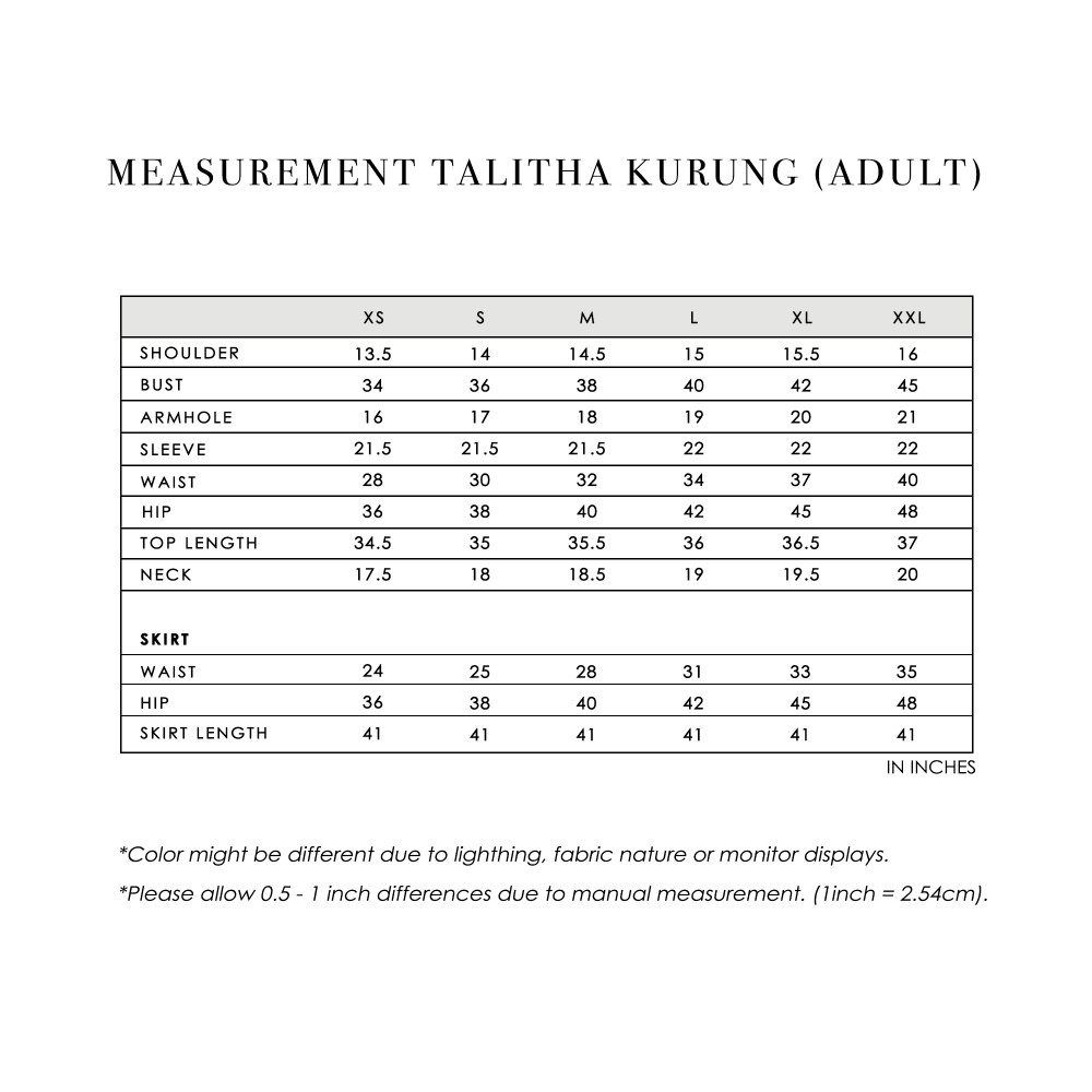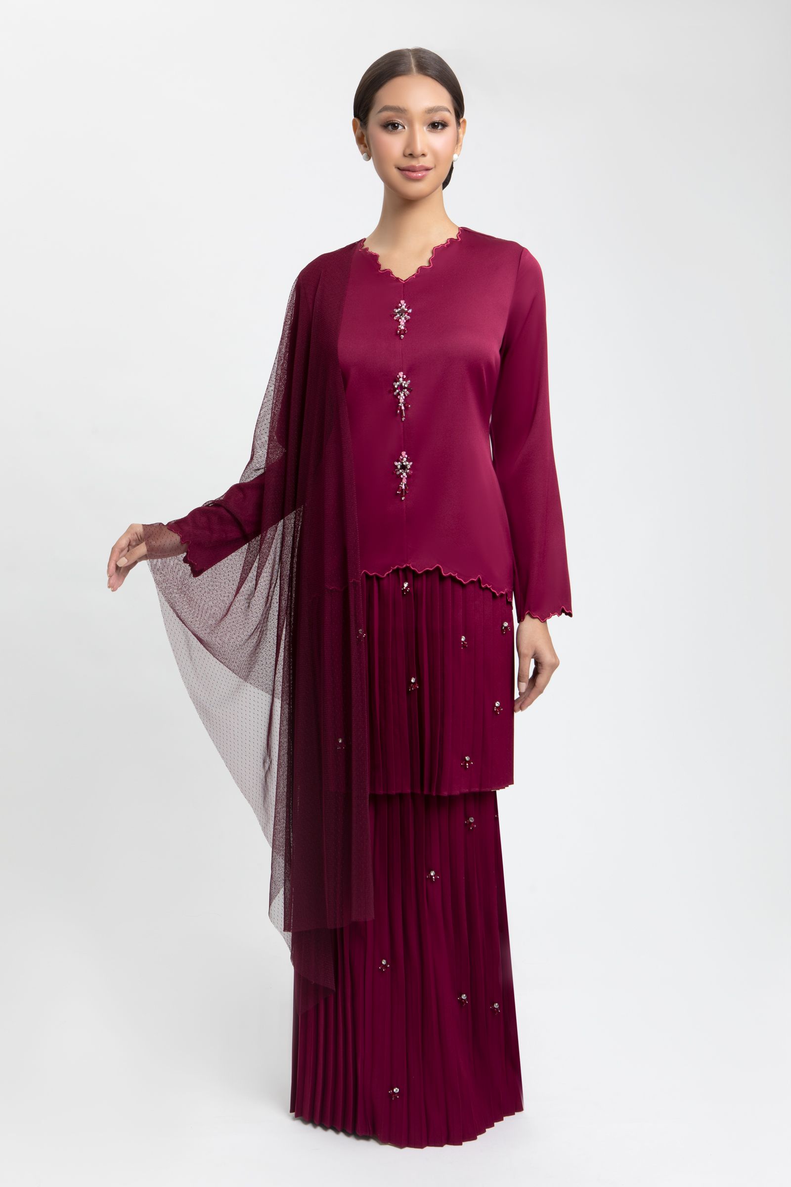TALITHA KURUNG crafted from cotton blend with Aritachi lining, features a V-neckline with front brooch, embroidered edges on top and sleeves, pleated top with embellishments and back zipper, paired with a matching skirt with halfway elastic waistband, side zipper and half pleats with beading.