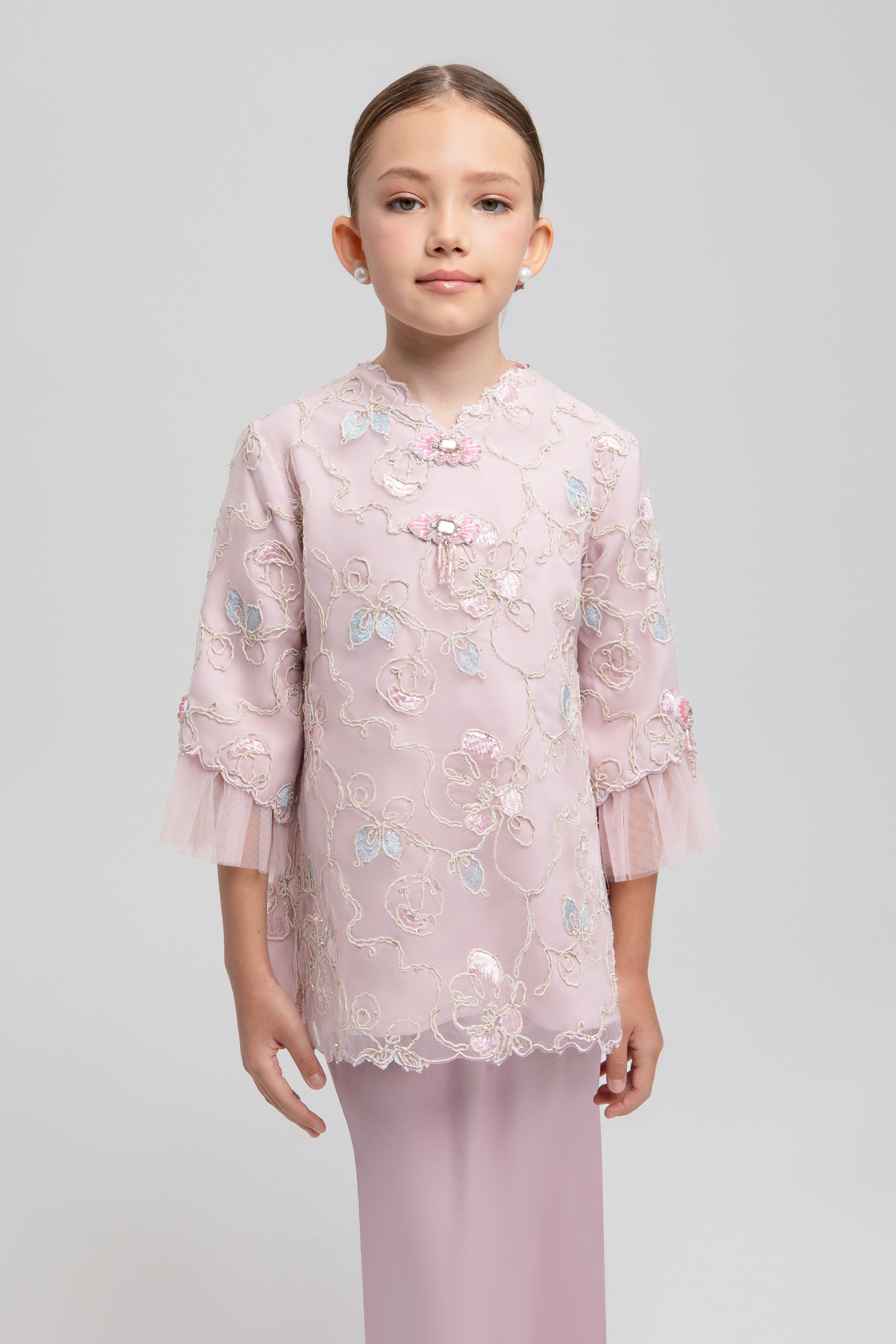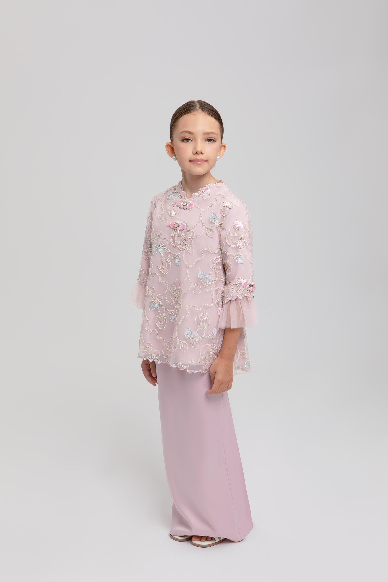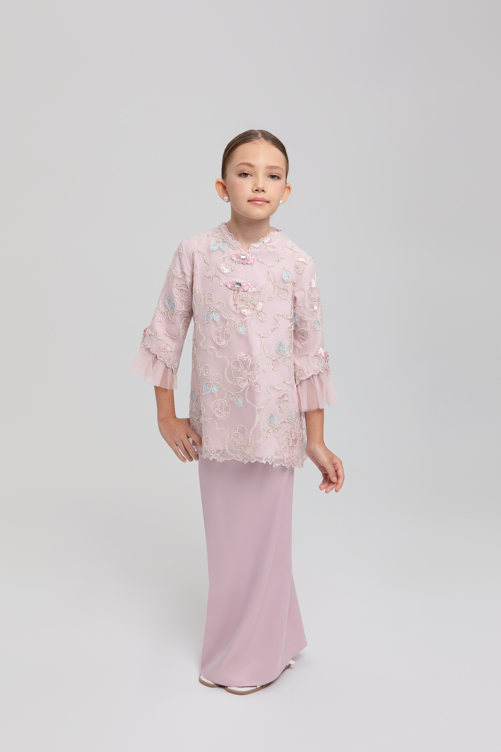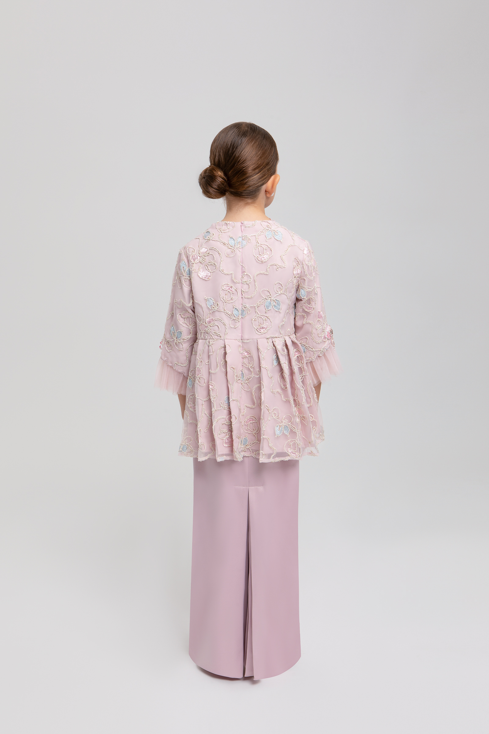 VALERINA KURUNG KIDS crafted from embroidered organdy with poly blend and full lining, features a V-neck with embroidered edges, 3D custom beading at the centre. pleated layered organdy sleeves, embroidered hem on top and sleeves, half pleated back top and back zipper, paired with a poly cotton blend pencil skirt with back zipper, back pleat, and full elastic waistband.
