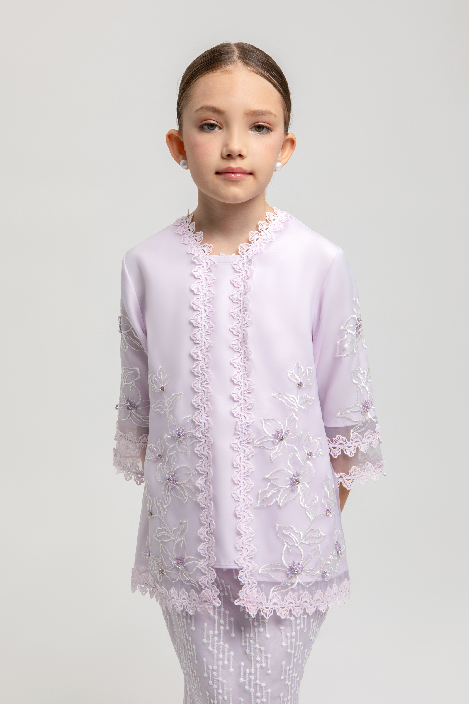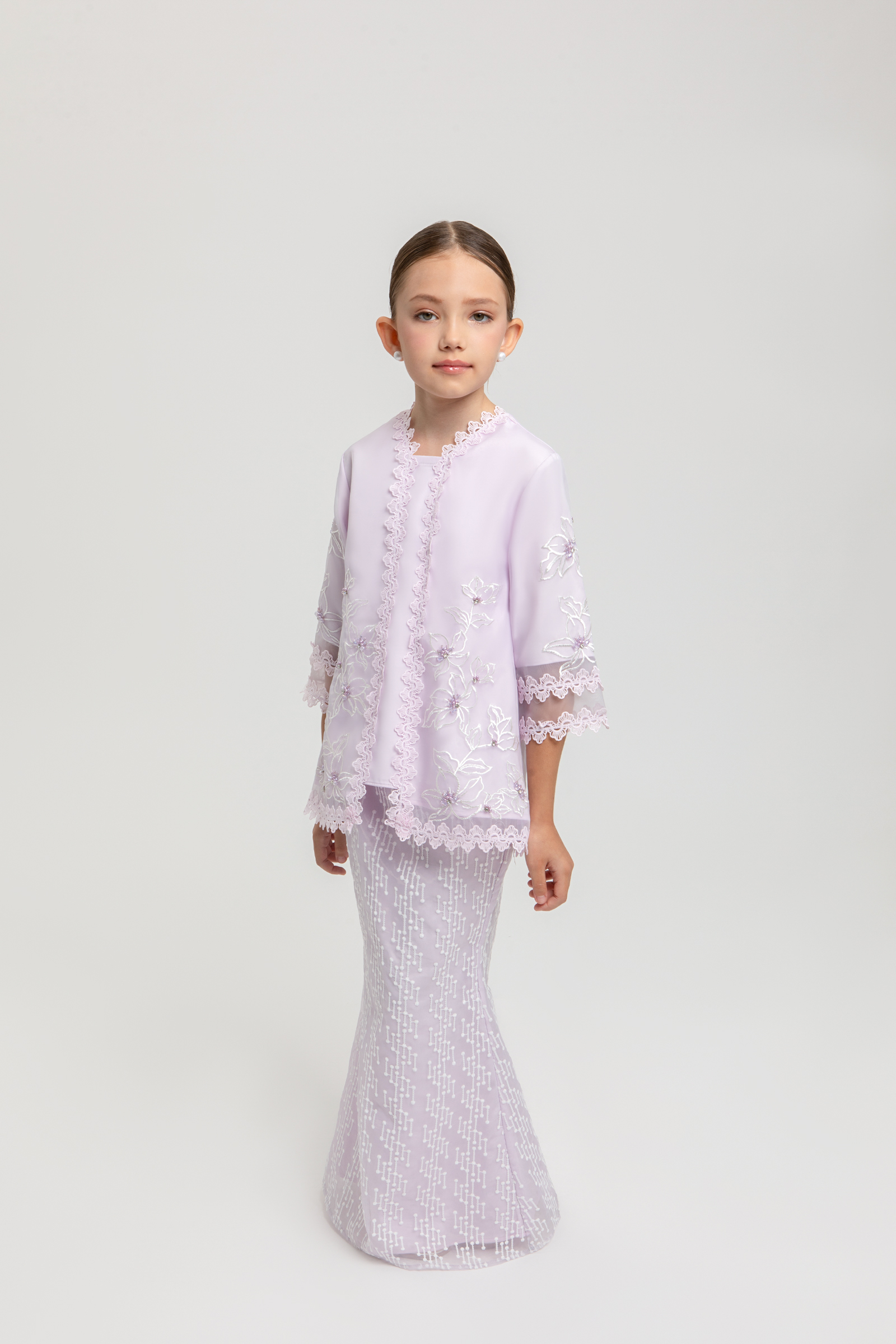 VELORA KURUNG KIDS crafted from embroidered organdy with poly-blend and full lining, features a square neckline with border lace, border lace hem on top and sleeves, beaded embellishment, layered transparent organdy sleeves, and back zipper, paired with a matching embroidered organdy mermaid skirt with full lining, side zipper, and Full elastic waistband.